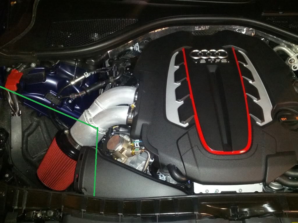 I think I will go with something like the one with the single filter in the pic but will make a cold air box where the green line is and 2 individual filters and intake pipes. I would also like to increase the size of the intake right to the turbo inlet. Might need a fab shop to help me out. The engine design is good for this type of airbox as all the heat that is generated is kept inside the engine V, making a decent cold airbox should be easy enough. Might even sound good or maybe a bit chavy, wont know until its done I suppose