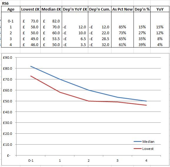 I looked at the cheapest and median prices in autotrader nationwide, to come up with prices by age and work out a rough depreciation profile. This takes no account of mileage or spec; just quick and dirty...