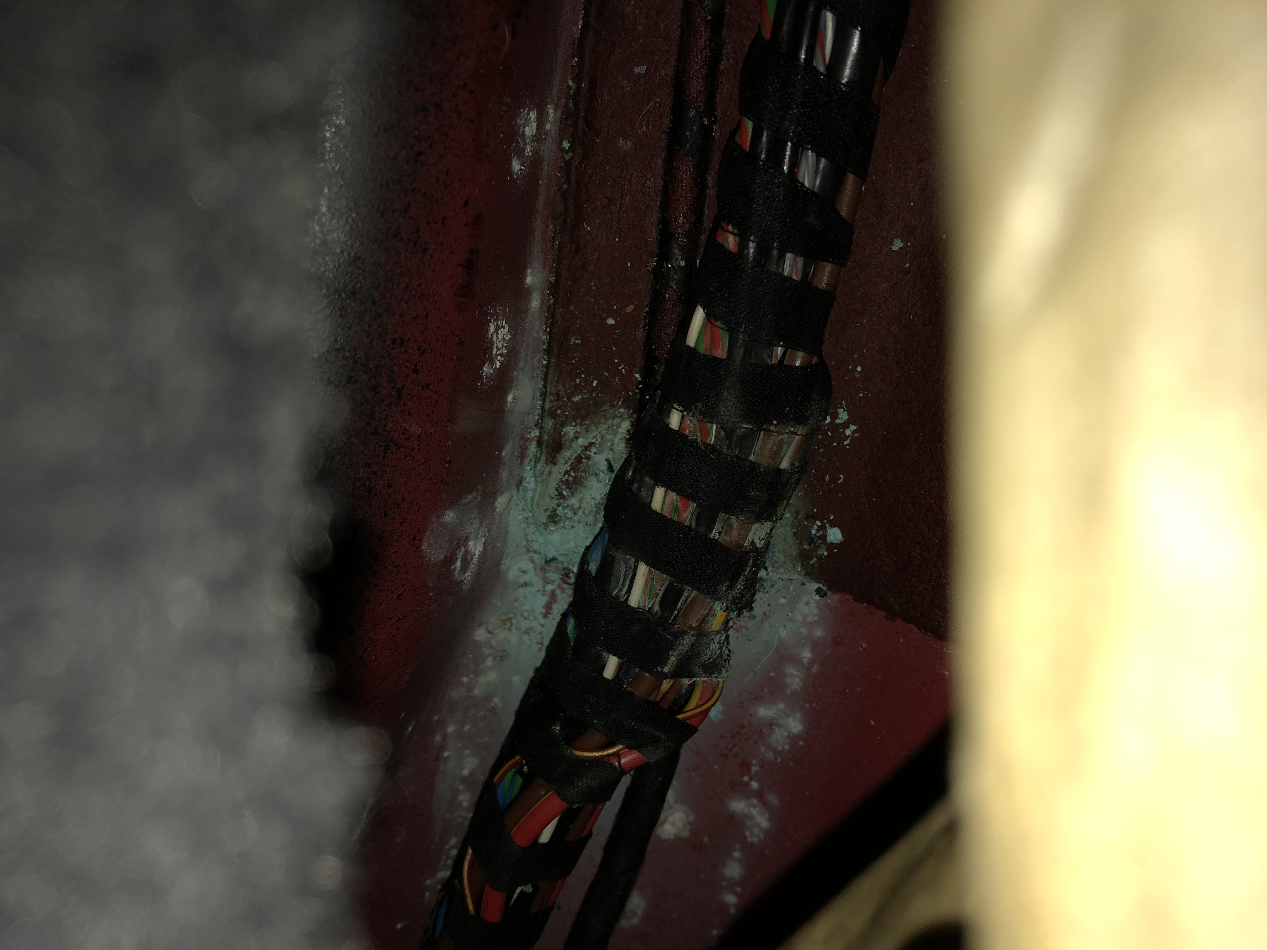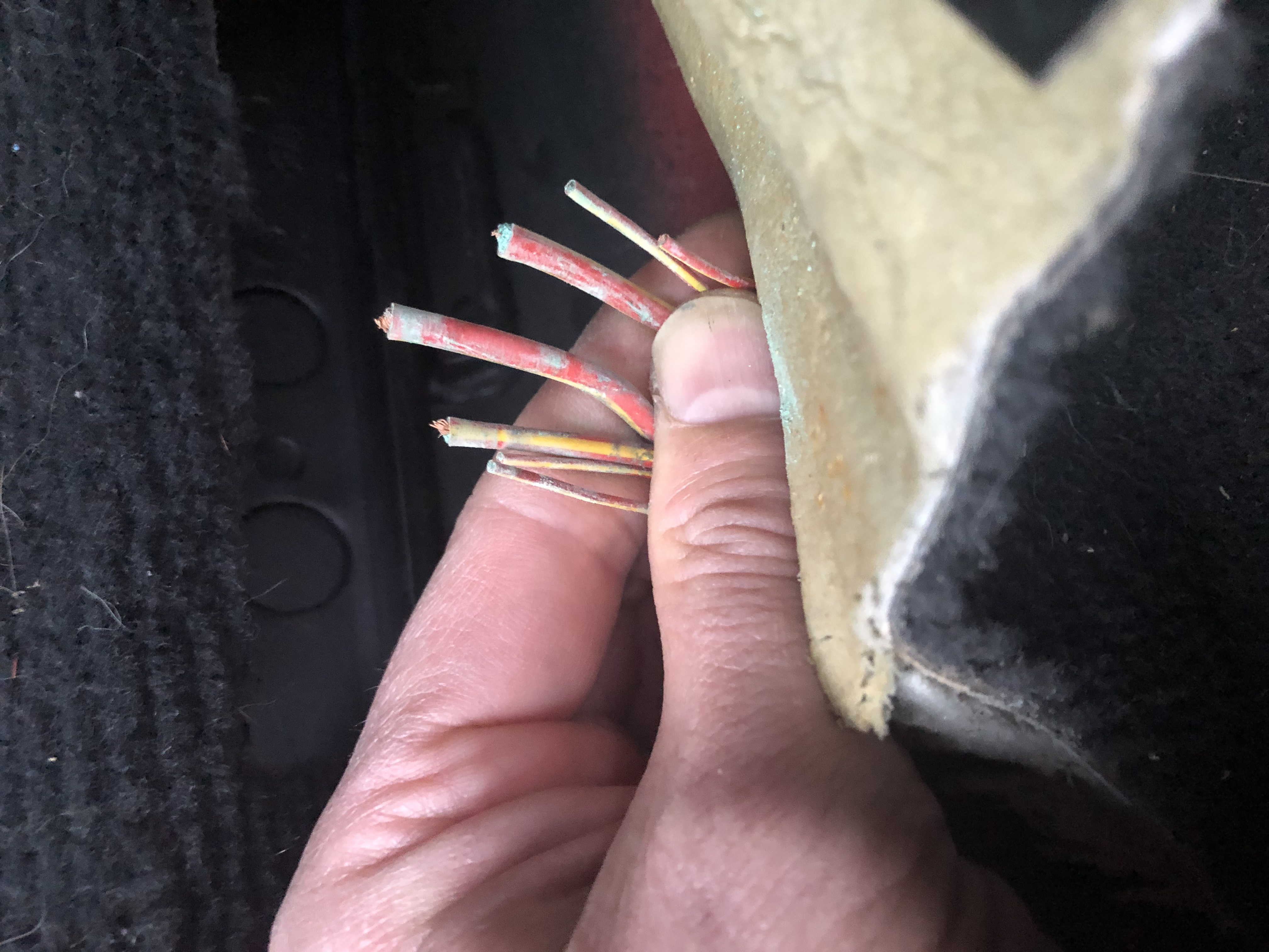 After a lot of research I found that there was a connection under the passenger seat by the transmission tunnel. Knowing this and the fact that this area can get damp with scuttle drain hole issues I thought it best to check this area out. I moved the seat as far forward as I could, pulled the carpet by the tunnel and the seat runner out and took a picture of the cable run. As you can see there is copper oxidation, a sure sign that copper cable insulation has failed.