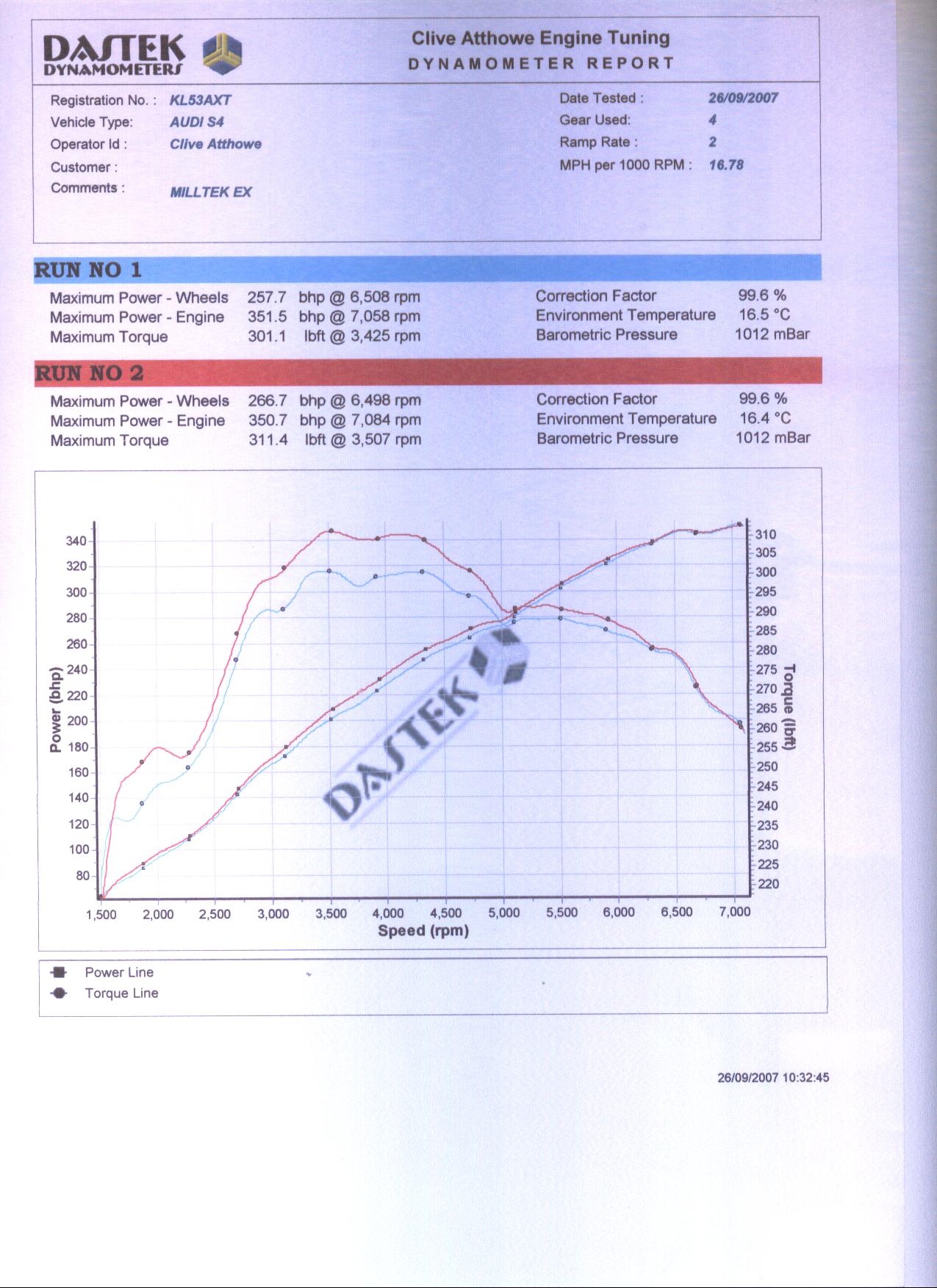 These graphs were when the car had 500 odd miles on it. It went straight from stock to AMD stage 3 (hence the two lines - before and after). AMD Stage 3 means its remapped and full Milltek (i.e. including down pipes, cats etc).