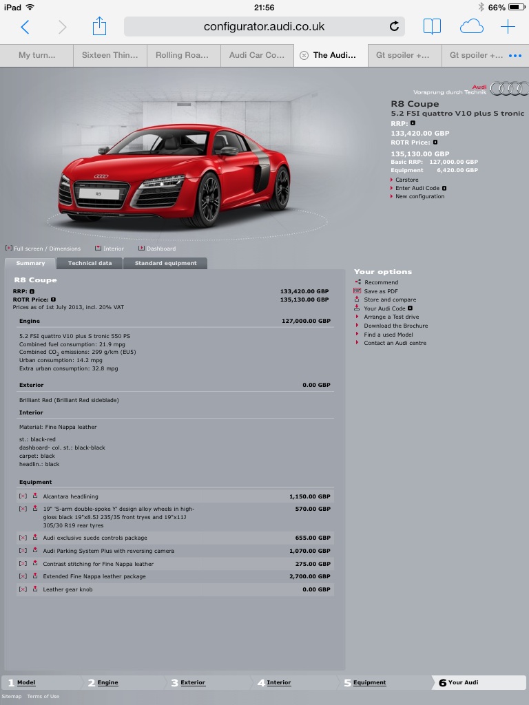 Brilliant Red Stronic car, black 5 arm wheels, black buckets, red stitching, carbon kicks, alacantara roof lining, suede wheel if spec able, advanced nav, rev camera, aftermarket gt spoiler / poss valved capristo