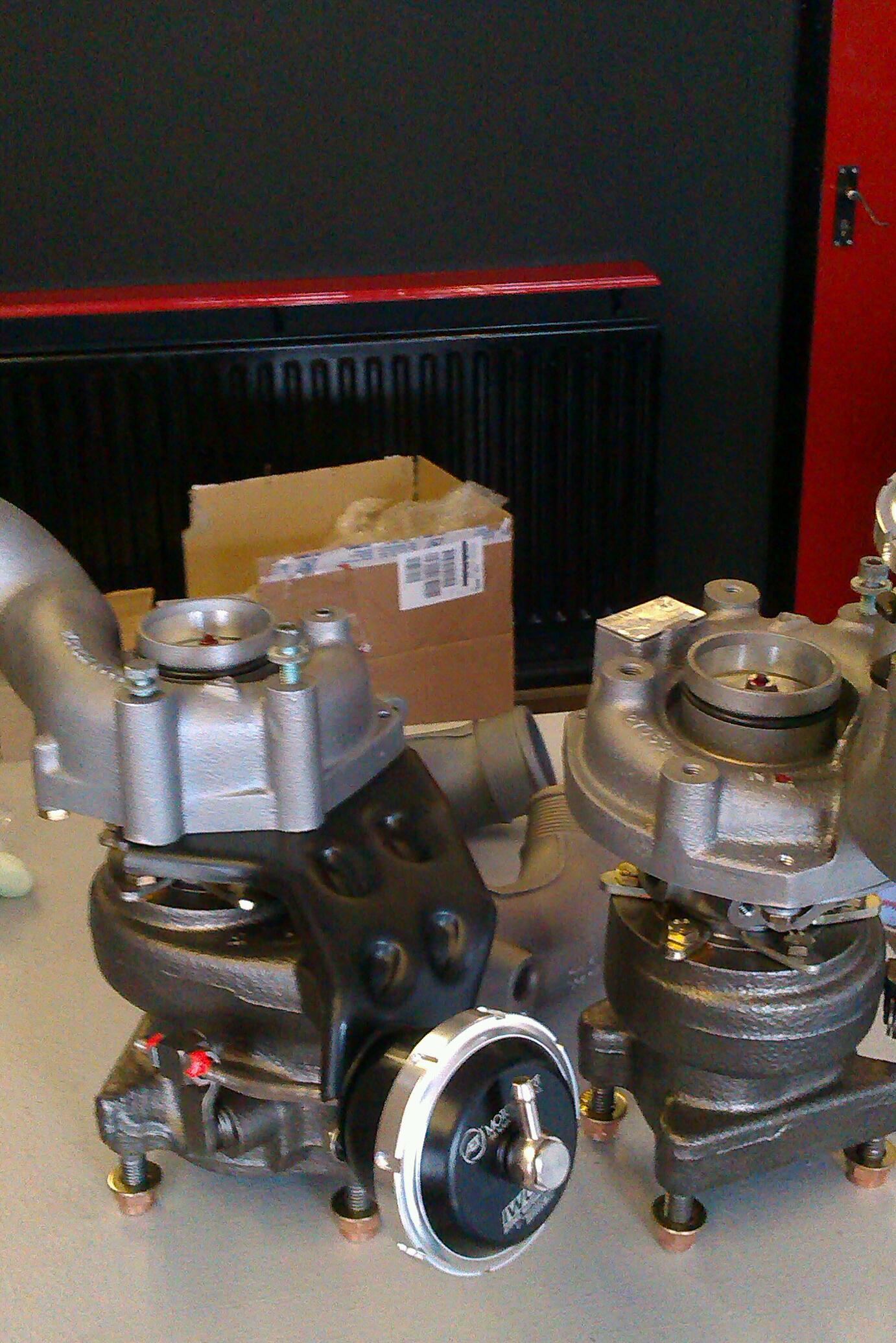 Well ladies & gentlemen, here they are; a brace of hybrid turbos all ready and waiting to spin some serious boost through the old V8.