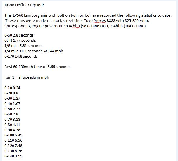 2011 Lamborghini Gallardo LP560-4 Heffner TT performance figures on street tyres