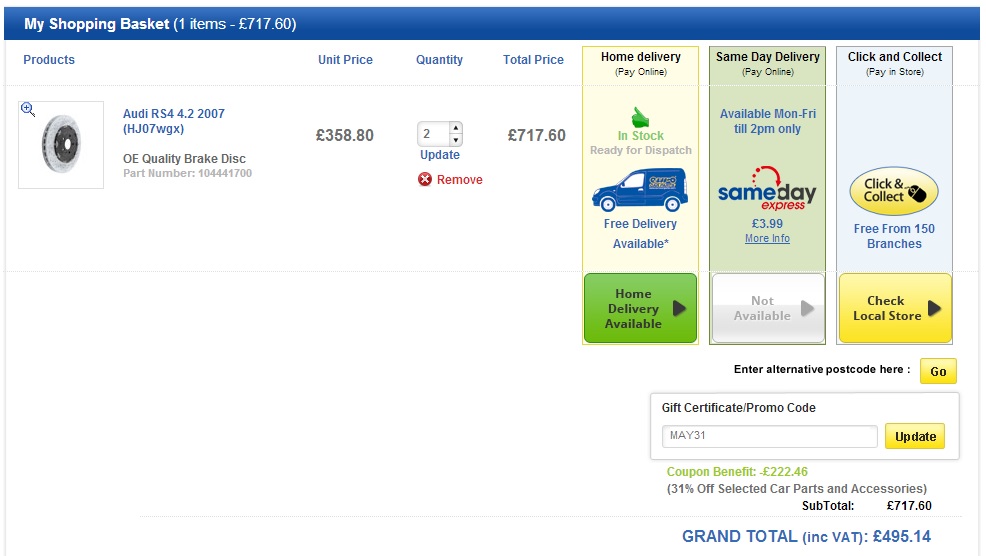 MikeFish wrote:Edit again: I just tried the MAY31 with a pair of front discs and it worked. Price for 2 front discs = 495.14!!!!!!!!!! El Cheapo!MikeFish wrote:I tried the SPRING30 & MAY31 code with the RS discs in my basket and it didn't work. I wonder if it inly worked cos they were for the Toerag?