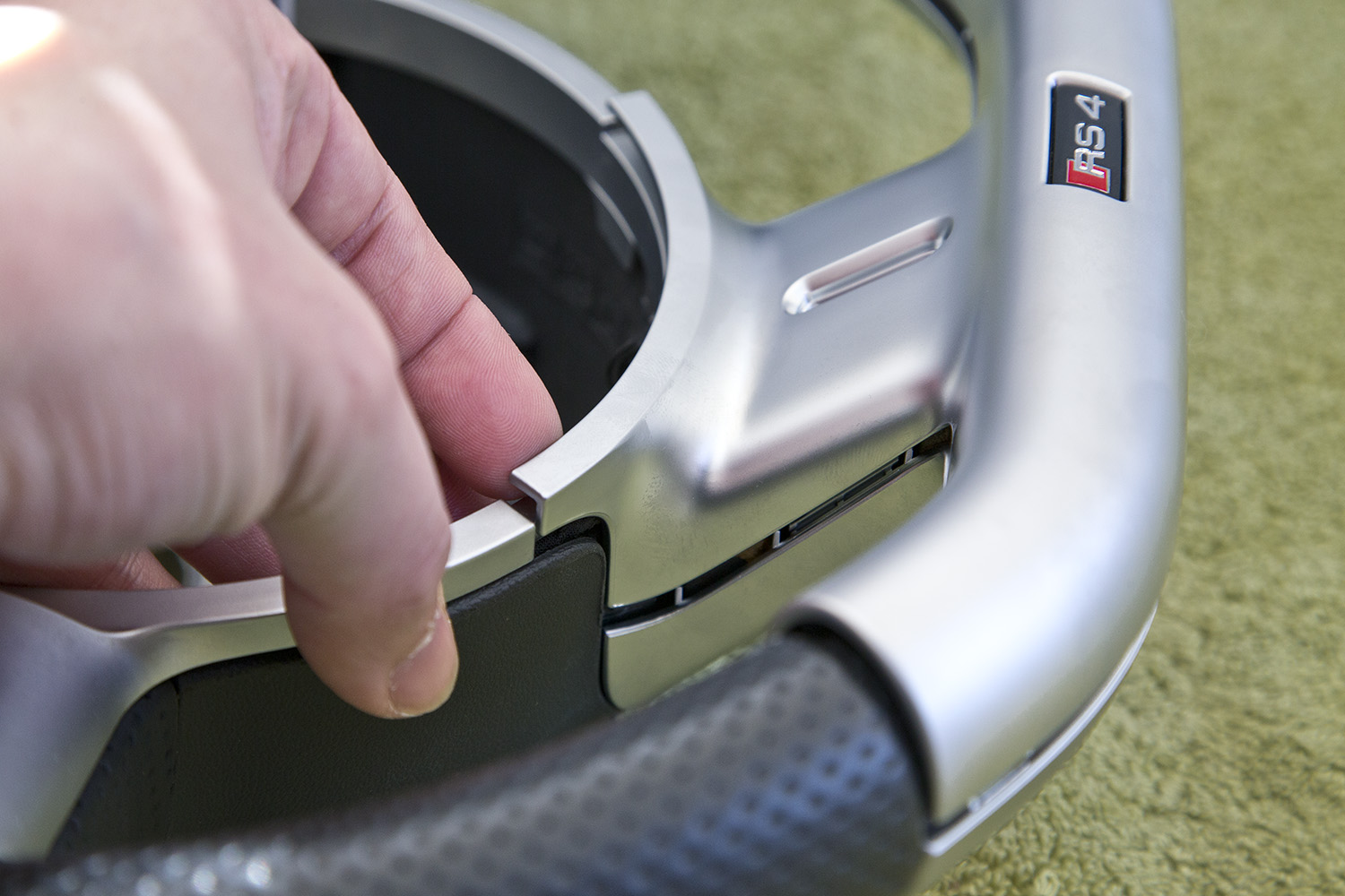 There is a similar RS4 badge available which is often advertised on the likes of eBay. This item is for B5 RS4’s and B7’s with the circular multi-functional steering wheel only. Some owners have fitted the badge from these models with some degree of success; the main issue being is that the fixing posts on the back are different to the apertures on the trim. Therefor it will require modification to fit the flat bottom steering wheel trim. I will not be detailing how to do that, in this post.
