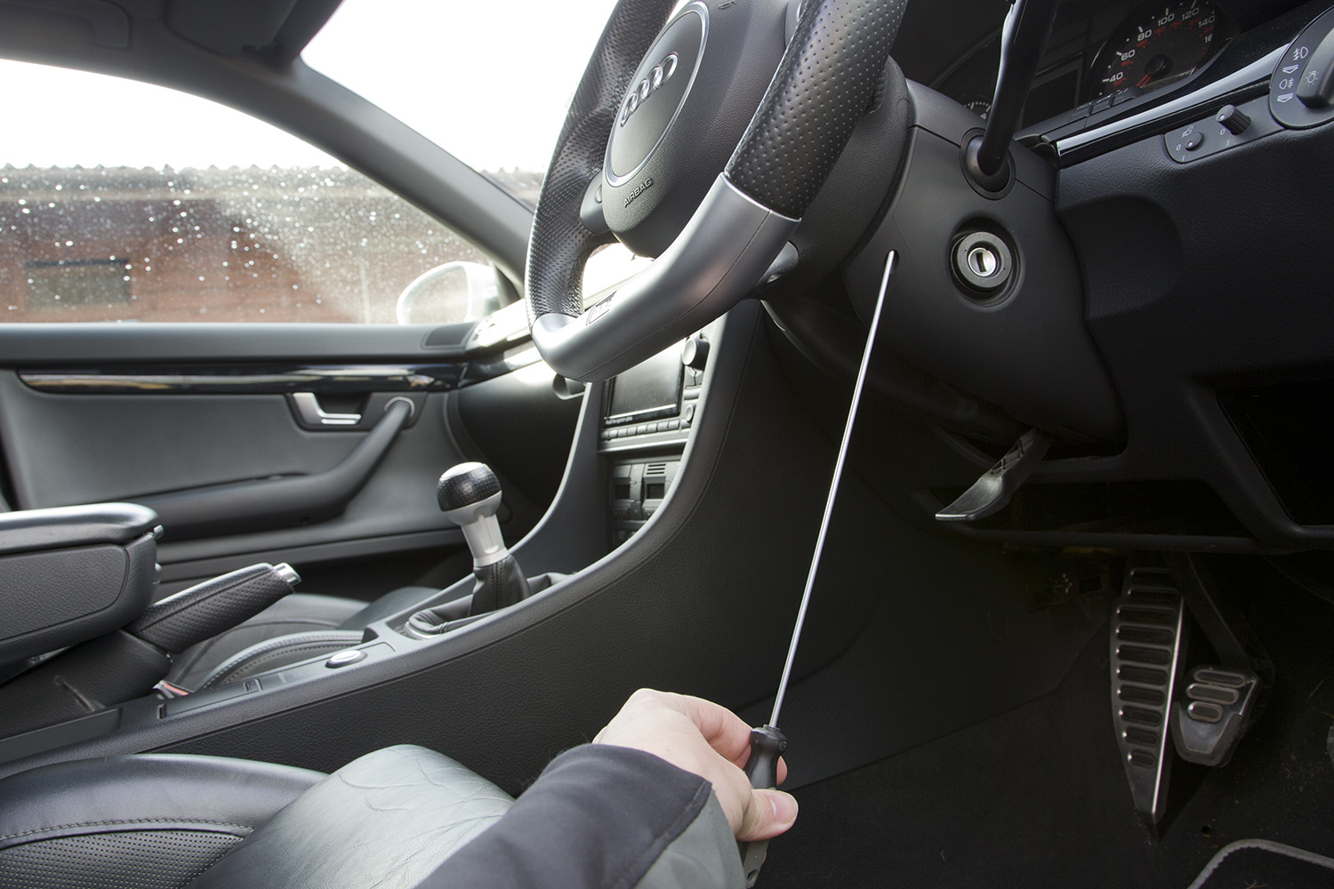 Now turn the steering wheel to be as straight ahead as possible, remove the key and engage the steering lock by moving the wheel slightly. It will probably lock slightly off centre, don’t worry. I find removing the steering wheel totally makes things far quicker and easier but you could do all the rest with the wheel still fitted to the car. I’ll carry on though and detail its removal.