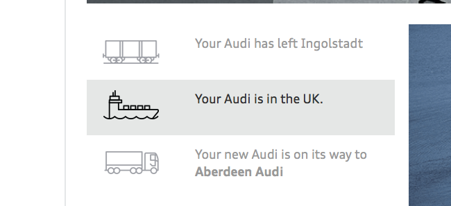 A ship docked last night at port of Tyne (where the car is coming in) at 19:10 last night which was from Emden. It was called "City Of Paris" but not sure if that is a ship Audi would use?
