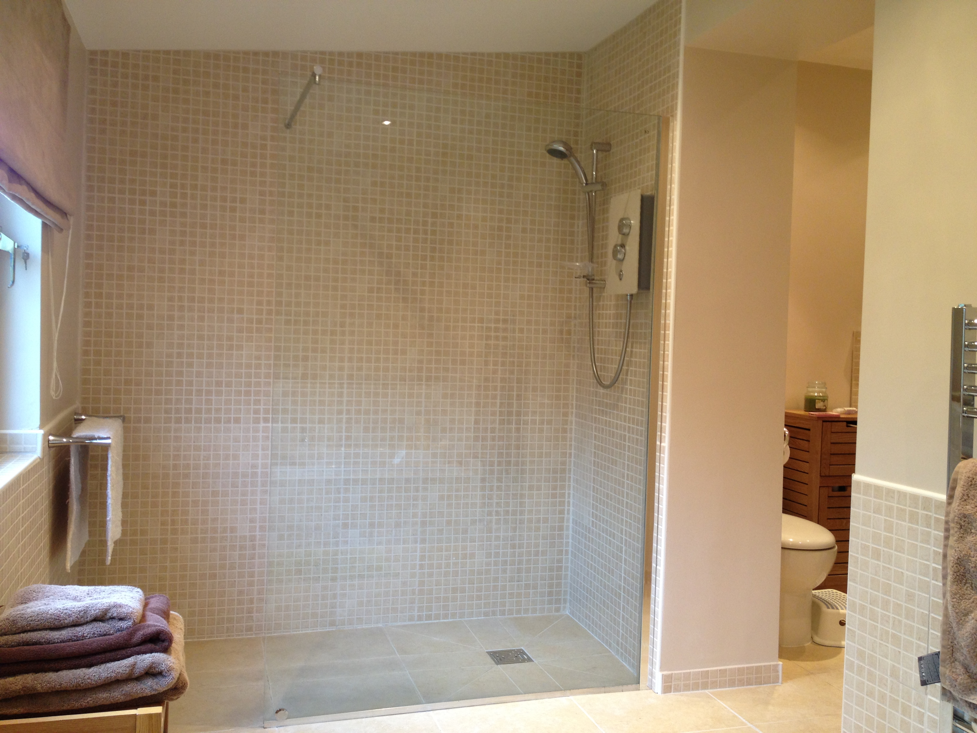 Done this in my old house a few years back, wet room floor but opted to keep the glass to keep the kids confined to that side of the room when having showers