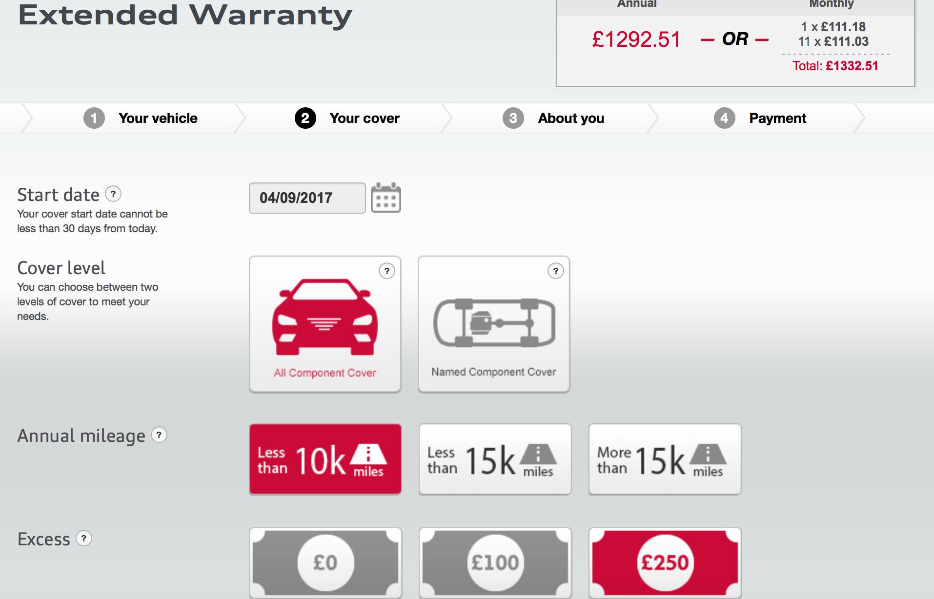 Just used the online Audi extended warranty quote, mine is due September, full cover,10k miles, £250 excess.