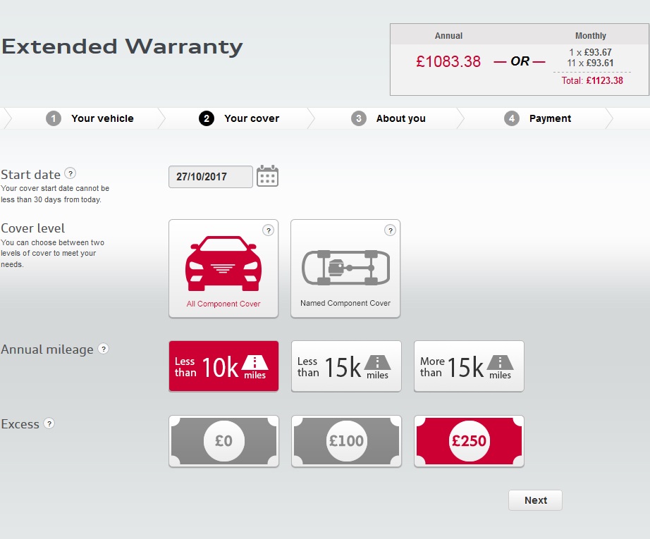 2014MY, just gone through 16K; £566 for one year additional warranty., 10Kmiles, all component cover, £250 excess