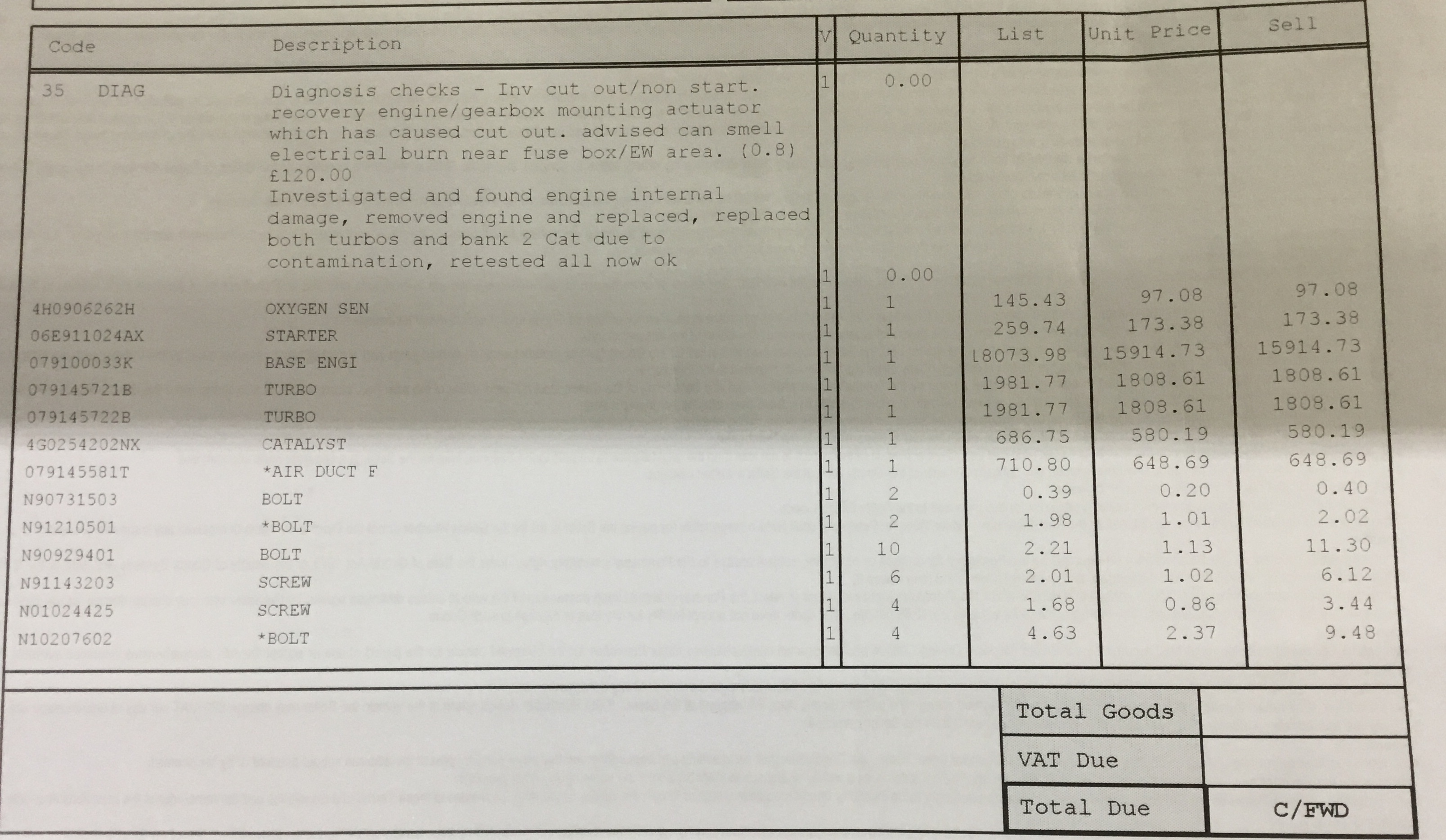 These were the main costs and final amount but that doesn’t include best part of 90hrs of Audi labour and a few other bits which came after this invoice.