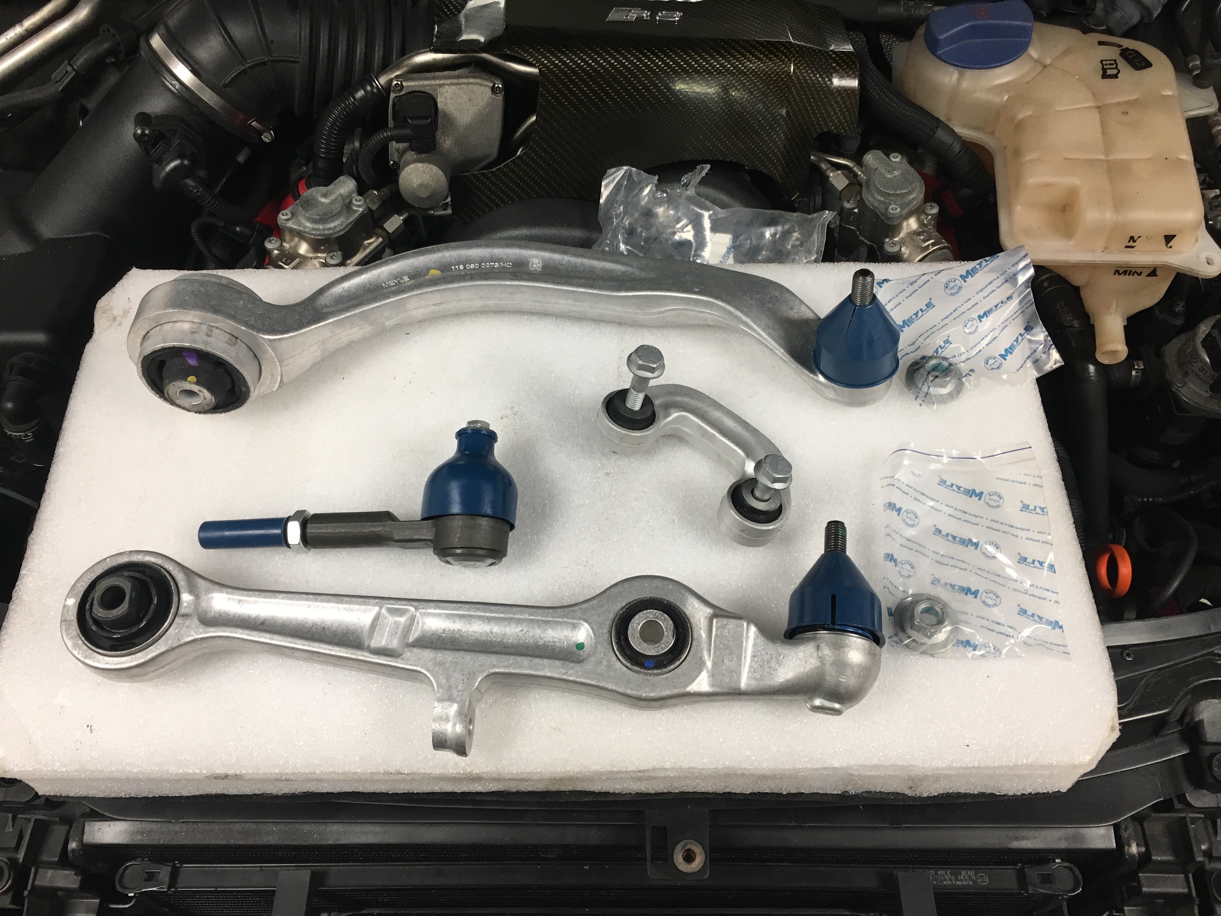 Now the front, the upper arms (all four) came up as an advisory in my last mot so I bought a full meyle HD control arm kit which also came with anti roll bar links and track rod ends and of course new bolts, like at the rear the subframe will be removed, powder coated and fitted with solid bushings, the front shocks will also receive 034 Motorsport density line top mount bushings.
