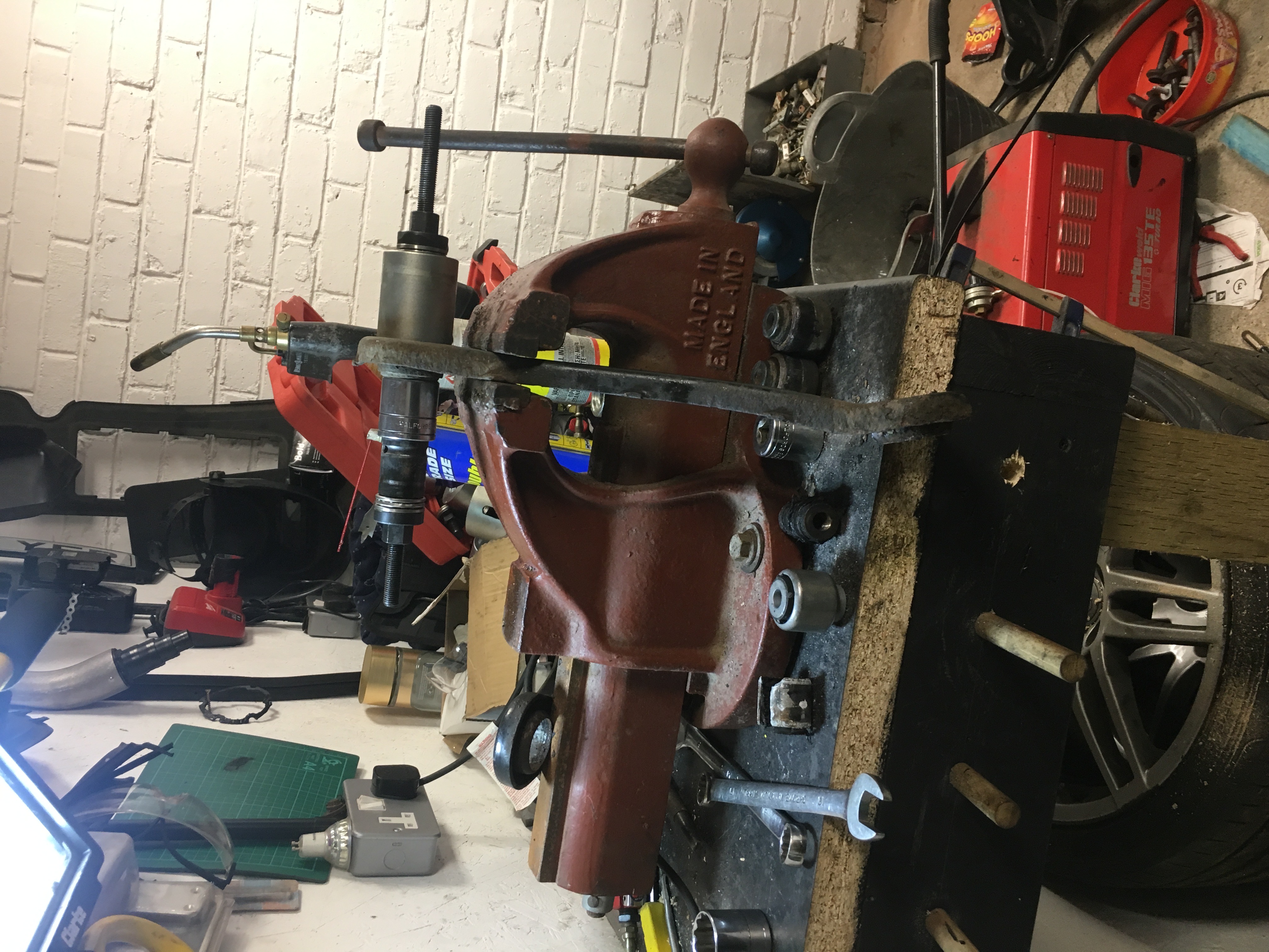 At the same time I removed the front subframe, I supported the gearbox on one of my jacks and borrowed a engine crane to stop the engine hitting the floor, I then removed the subframe and removed the bushes, using my bush/bearing tool I managed to get the bushes moving and then with a whack of a big hammer they popped out, I'm led to believe that the front subframe bushes have loose tolerances which is why they come out so easy.