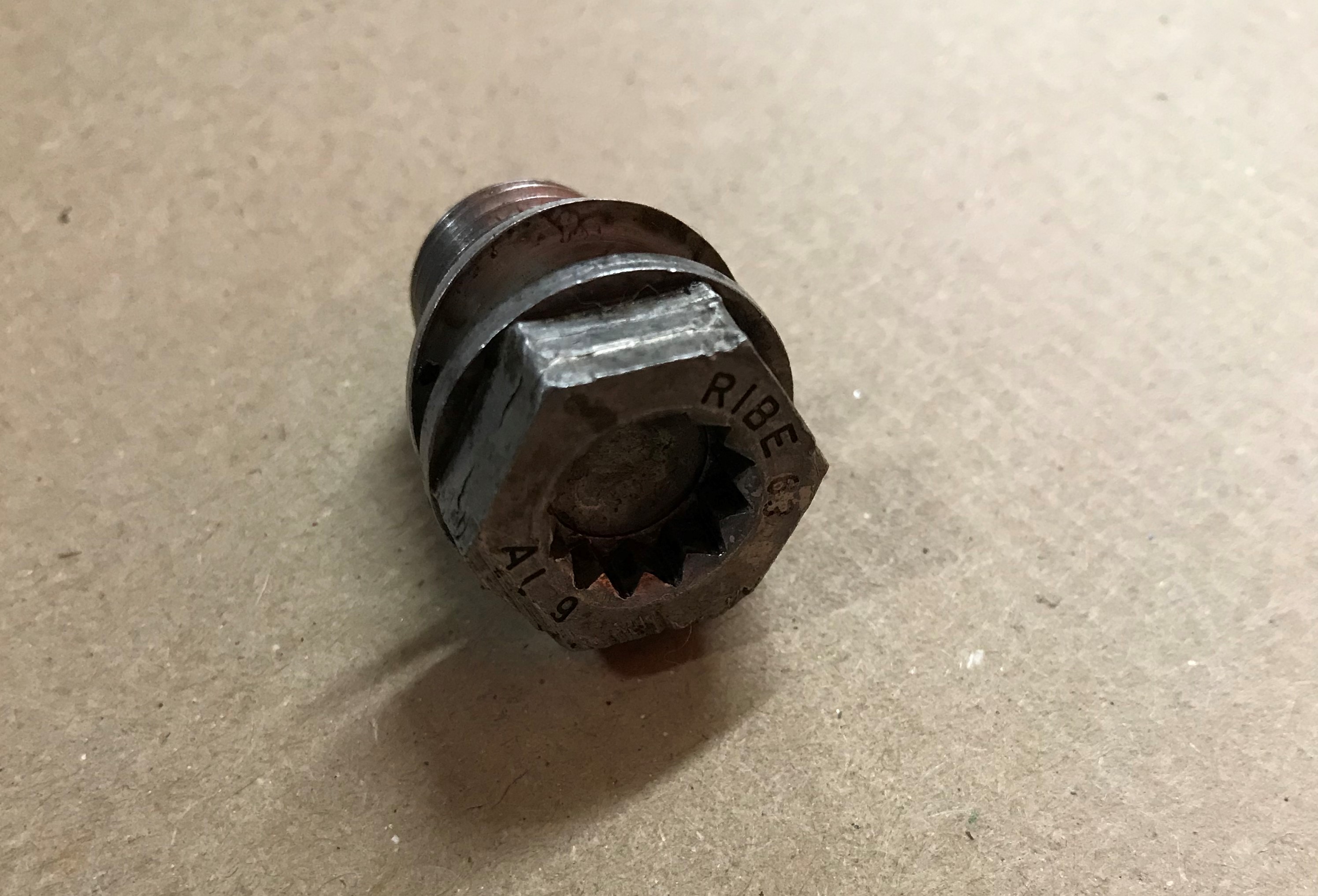The part that ETKA lists as being the correct part is made from steel. The dimensions for it are M14x1.5x22 and it is 19mm across the flats. There is no triple square or similar hole on the head that can be used to loosen/fasten it. Here is a picture of it below;