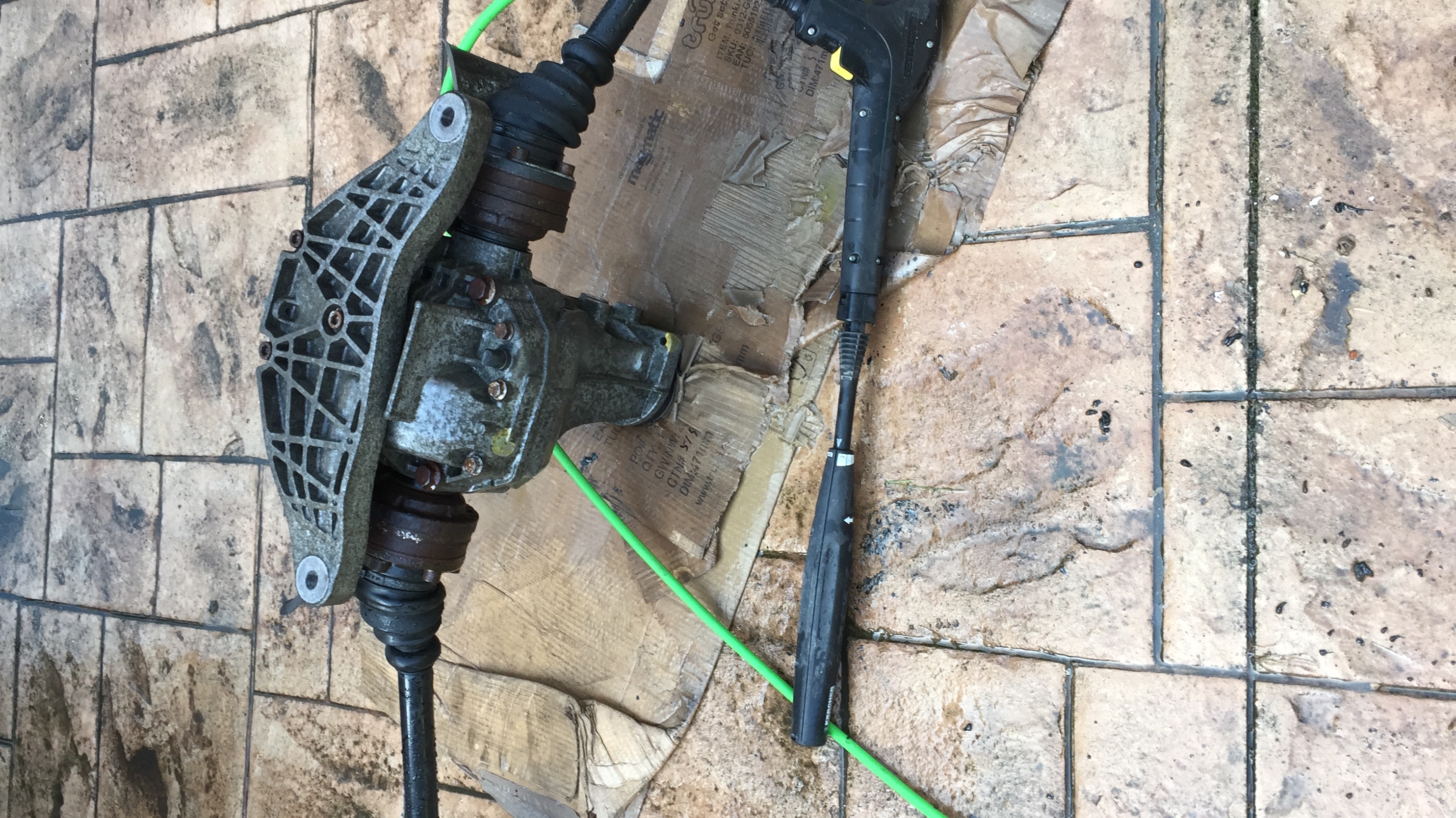 I had a friend come and help me lift in the rear diff and shafts so gave it a quick degrease and power wash.