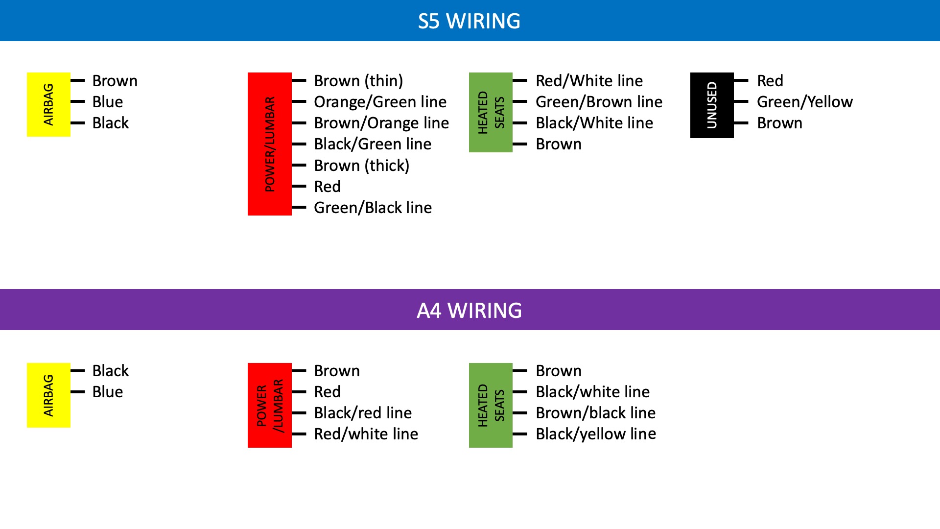 I have made a map of the existing wiring in both my A4 and the S5 seats and have identified what I believe to be common bits from using the search function here, but I cant seem to find any wiring diagrams for either car. Can anyone look at the below and help me identify whats what on these cables and/or if I have labelled anything wrong so far?