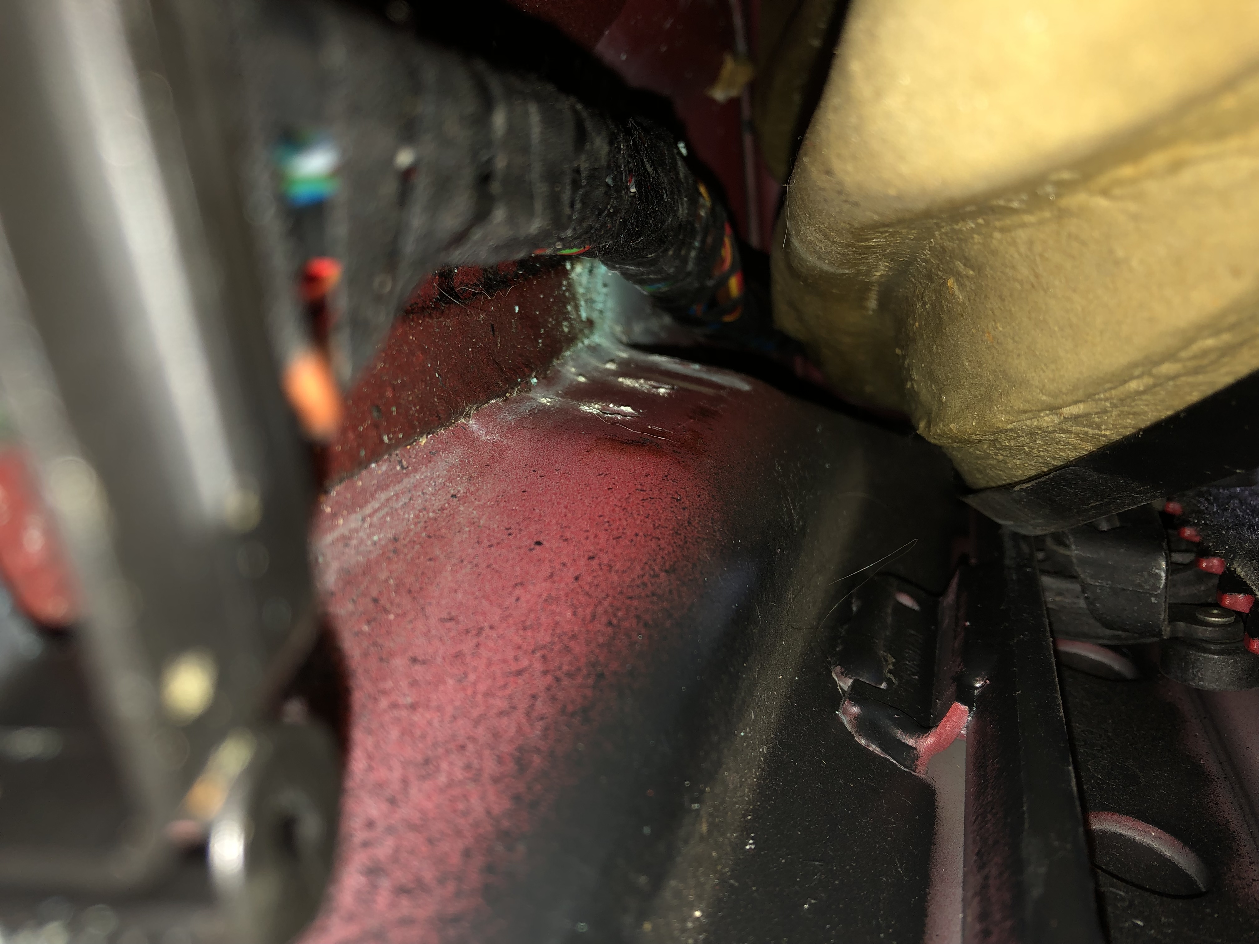 After a lot of research I found that there was a connection under the passenger seat by the transmission tunnel. Knowing this and the fact that this area can get damp with scuttle drain hole issues I thought it best to check this area out. I moved the seat as far forward as I could, pulled the carpet by the tunnel and the seat runner out and took a picture of the cable run. As you can see there is copper oxidation, a sure sign that copper cable insulation has failed.