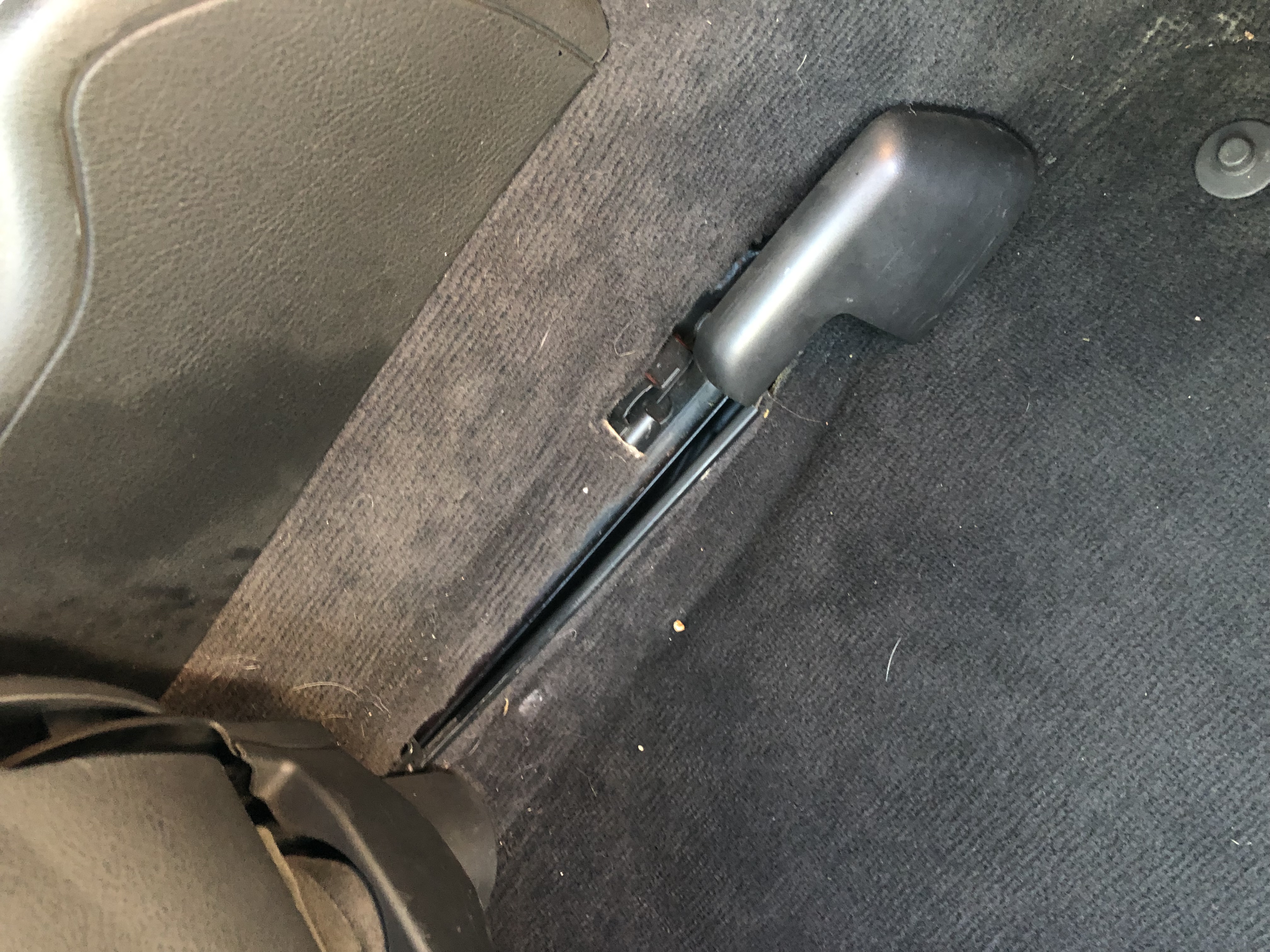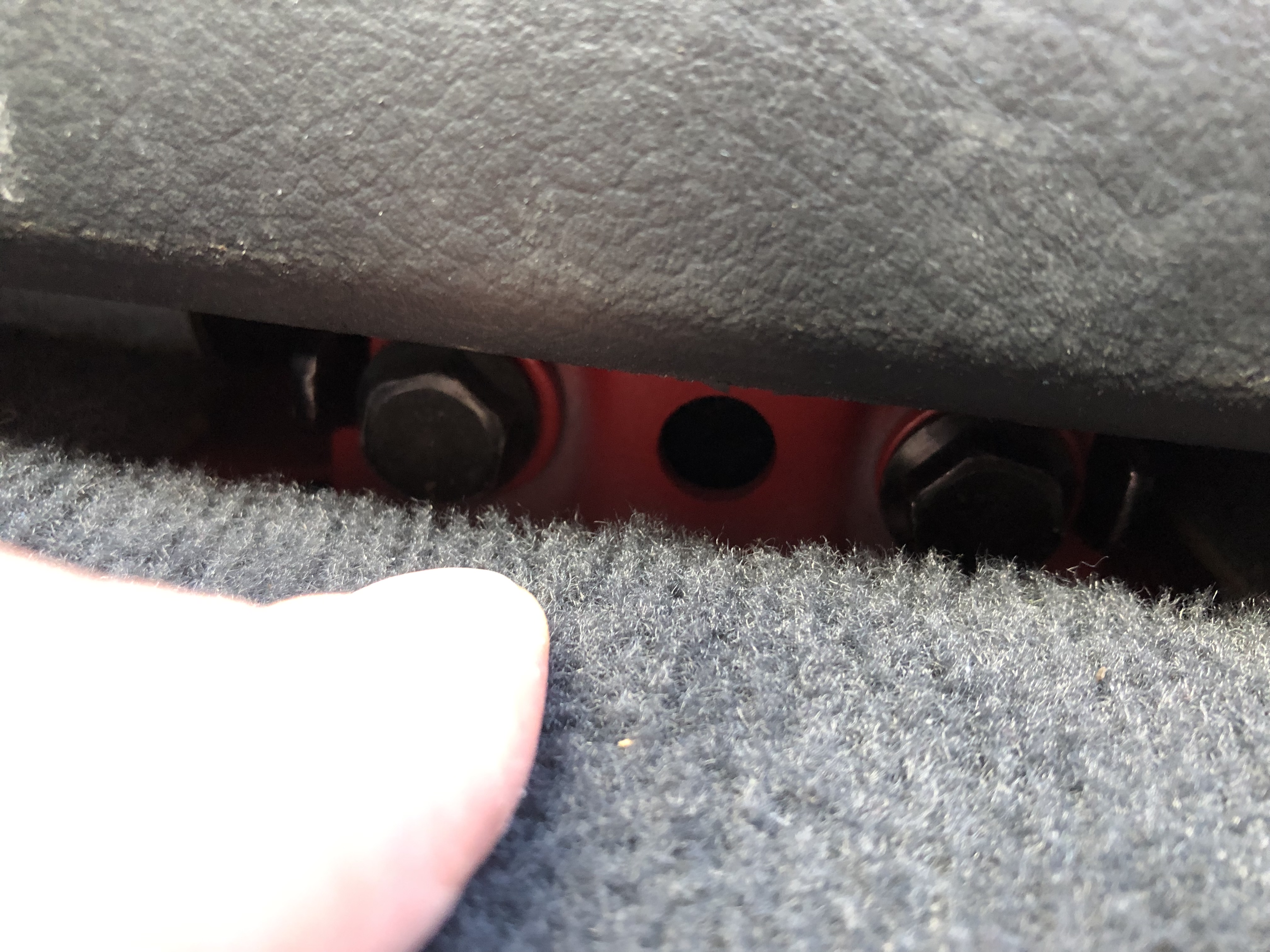 Remove both side end caps from the seat runners, they just popped off. Then, with the electric seat adjuster, move the seat to near it’s furthest most position. Now remove the two 13mm bolts from the front of the seat under the plastic trim. Unfortunately to be able to really get to the issue I had to cut the carpet a little from the front end of the seat runner cut toward the under seat vent. The cut is around 6” and is totally hidden when the seat is refitted.