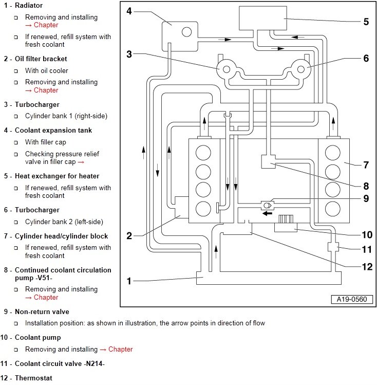 On the post 2003 drawing it's not shown the flow direction trought the turbos. I assume it is because the flow direction is both ways. From the radiator trough valve 11 and the pump 8 to the turbos when the engine is stopped.