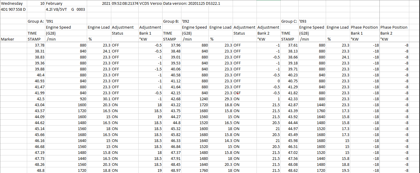 Hey Everyone, long time lurker, first time poster. I have always found this forum to be a great resource in my nearly 13yr relationship with my RS6. I am in the middle, or rather WAS in the middle of changing the timing belt and valve cover gaskets. Massive oil leaks dripping onto the exhaust manifold, so I decided to do the valve cover gaskets while I was in there. Everything went pretty well, this is my second timing belt job. I must say, access to the right/starboard/bank1 valve cover was an absolute nightmare. I only managed to break off the little vacuum nipple to the SAI valve before loosening it from the head. I think this is more of an issue than the water pipe, IMHO. I think I'm OK there though, as I was still able to snug up the vacuum line on what was left. I put it all back together and performed the timing procedure (all new belts, tensioners, and pulleys) with proper tools (cam lock bar and crank pin) to spec and rotated by hand a few times. I had to do this a couple times to get it right. When I was able to start the car and check for fault codes and measuring block 93, I got one fault telling me the cam position sensor (G40) reading was "implausible" and block 93 only showed data for bank 2 (which was -7KW). I decided to tear down the front end again "check" the sensor. I checked the harness and it seemed fine. I ended up replacing that sensor, because why not. I put things back together enough to run the motor. That fixed the fault code for G40 and I was able to get proper readings from block 93. Now, here is where we get to the good stuff. The readings I get from block 93 are as follows: Bank 1 = -18KW and Bank 2 = -8KW. I am sorry, but I can't tell you what the readings were before I started. I am racking my brain as to where to begin with this. The Bentley says the tolerance is +/-6. After I took the readings, I checked the belt again for any misalignment. Everything checked out, crank at TDC and cam lock bar went on easily enough. Even the cam belt damper was in spec. However, I will definitely be re-tensioning the belt for my own sanity. But my big concern is the difference between the two banks on bock 93. I visually checked the cam chain tensioner pads while I had the covers off and they seemed fine from what I could tell, no breaks or major wear. I am at 120K miles, but the thought of removing the cams made me nauseous. I have attached a screenshot of the VCDS data log for blocks 91, 92, & 93. Any incite you all can provide is greatly appreciated.
