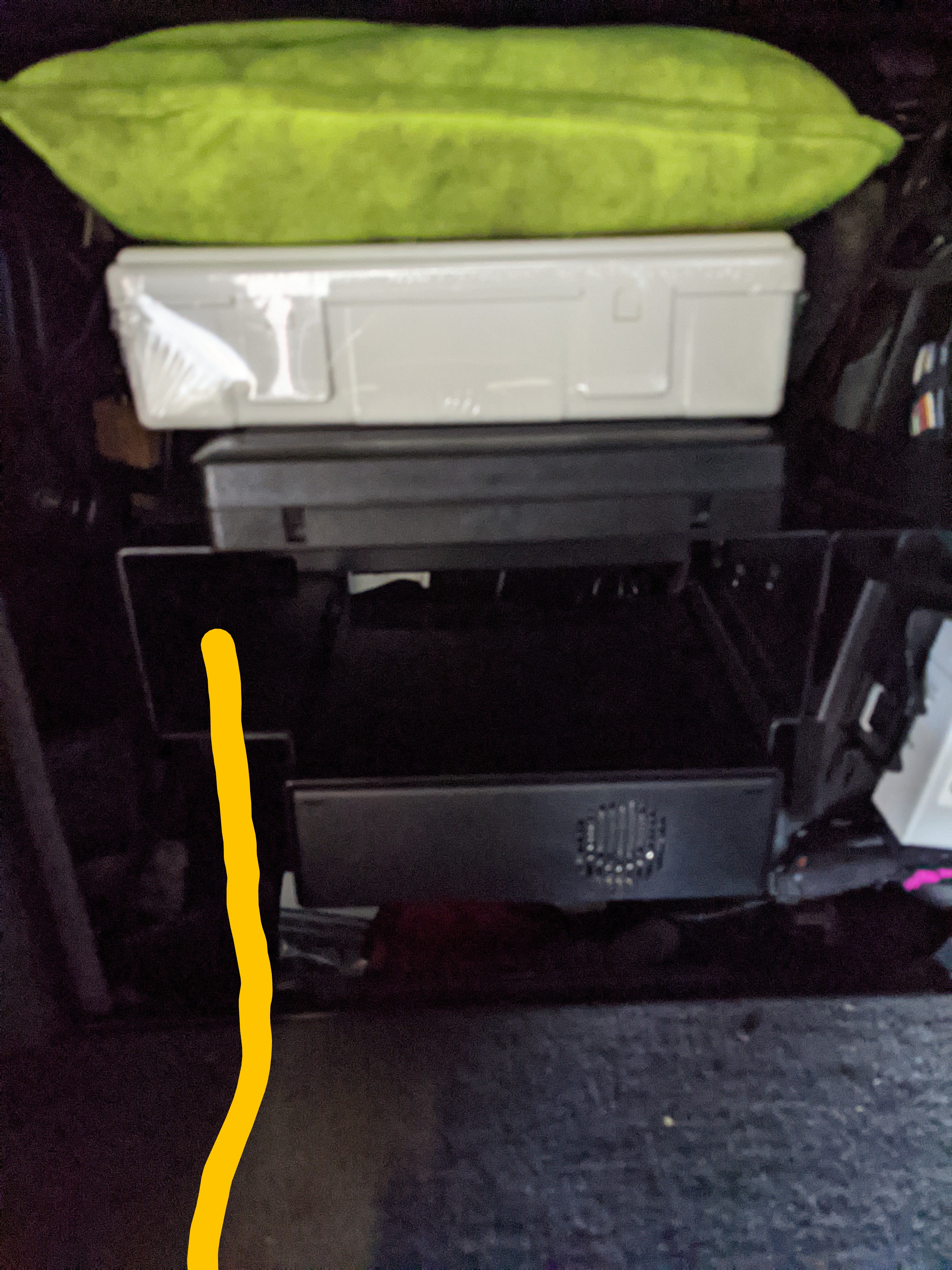 I was thinking to run cables from the battery connection to the left-side storage space where the CD player used to be: