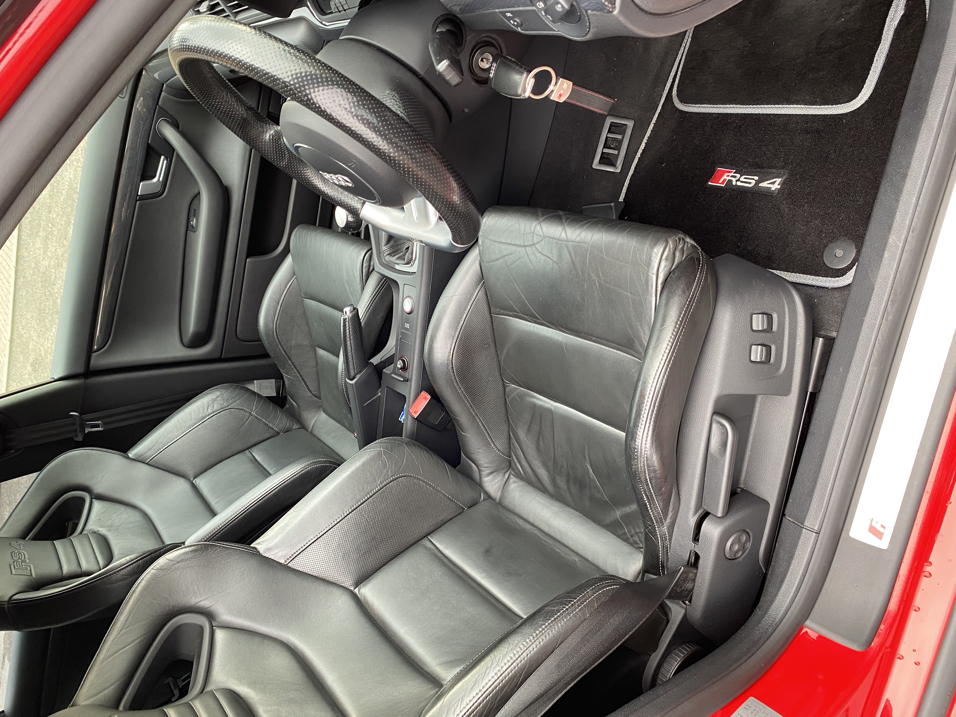 Misano mettalic red with black leather interior - flat bottom steering wheel and RS4 wingback bucket seats.
