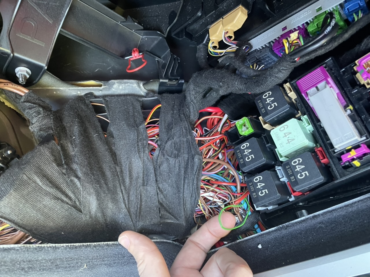 - one at slightly at side of car which you can see the grommet. That has what looks like proper wiring which runs along side of fuse box and joins into the big jumble of wiring to the left of fuse box.