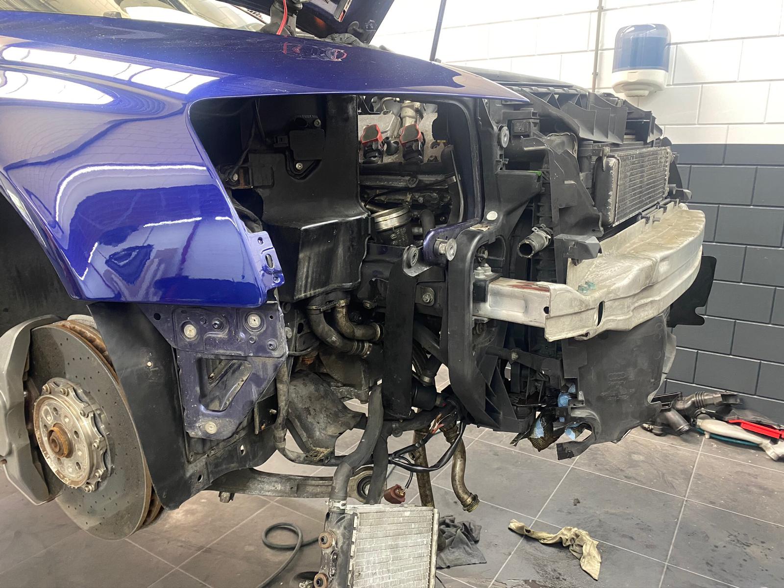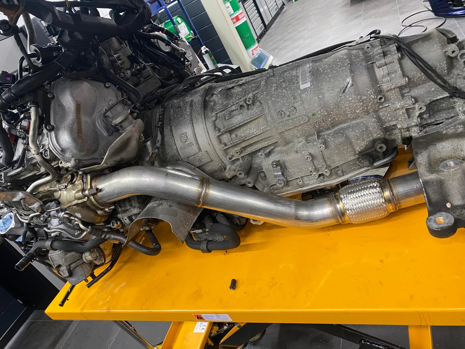 I forgot to place catalysators in the exhaust line in all the excitement, so before the car can drive on the road legally here we still need to add these. Due to circumstanced this will be done 1st or 2nd quarter of 2022 together with the software. From the downpipes to the back we will be creating a custom titanium 3" line with two X pipes and custom muffler boxes, we hope that this way the sound will sound better than just stainless steel.