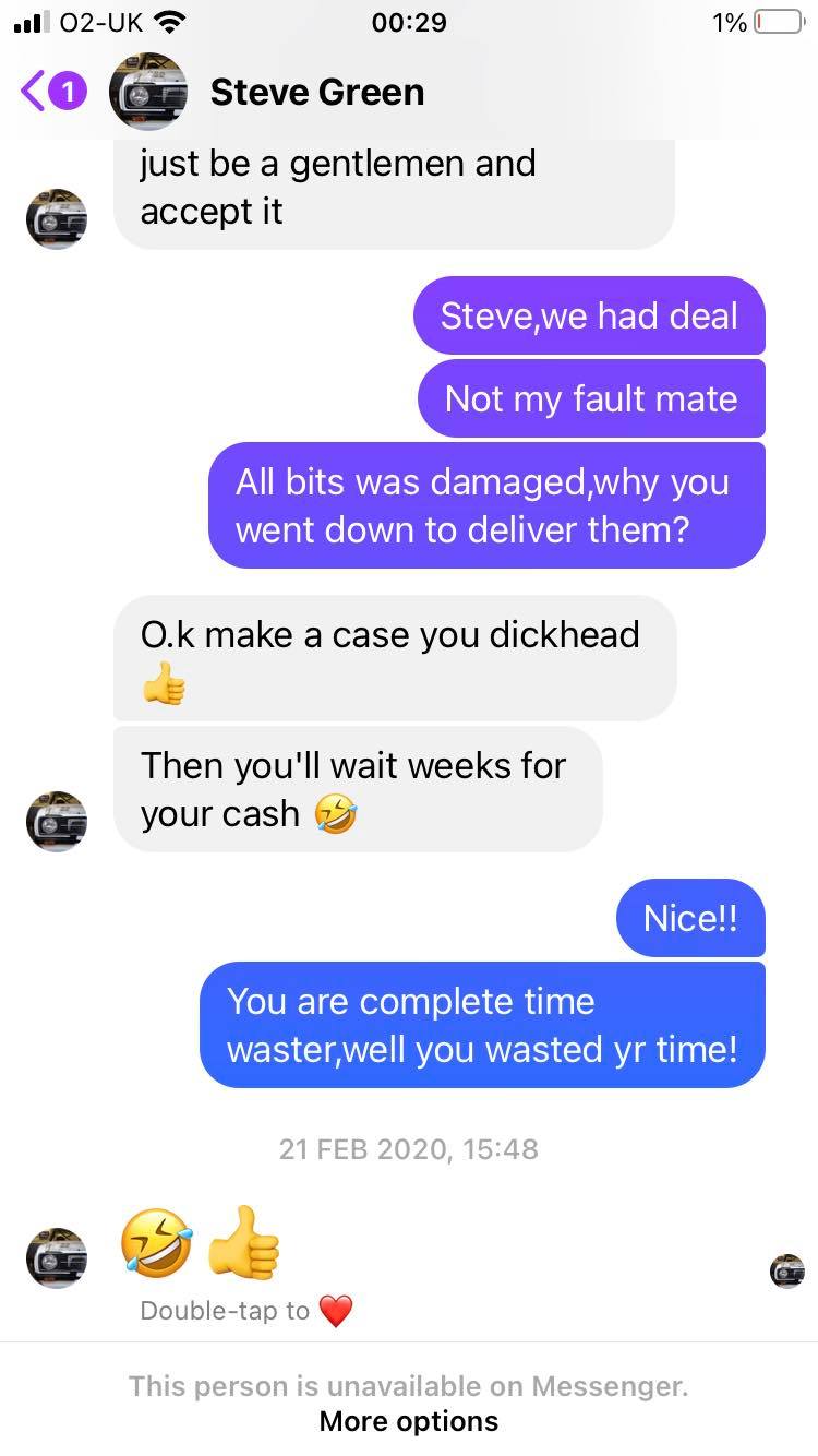 yeah,over the phone is all good,but ones you get parts they fooked and he blame you!Fooking moron,good its only £100 ive lost,did asked 100s time if theres no cracks damage etc,shame he break them cars and cant be honest,we need Jimbo back in bussines