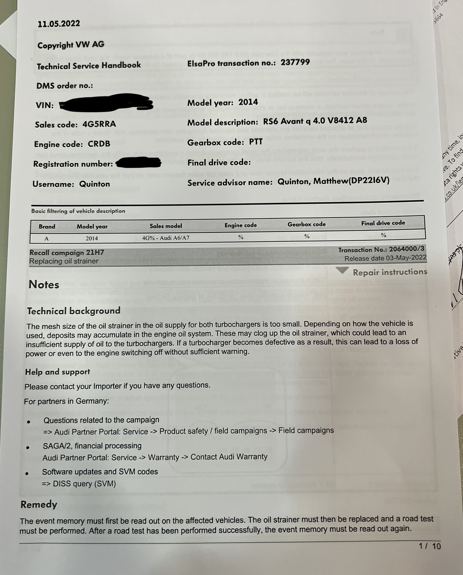 Short story, the gauze on the turbocharger oil strainer is too small, restricting flow. The associated work on our cars is a 12hr engine strip down and replacement of a LOT of parts (4 pages of parts to be precise). I took a pic of the cover sheet below if anyone is interested. But seemingly next time you’re in for work or if you want to get this sorted you’re looking a a few days in the workshop.