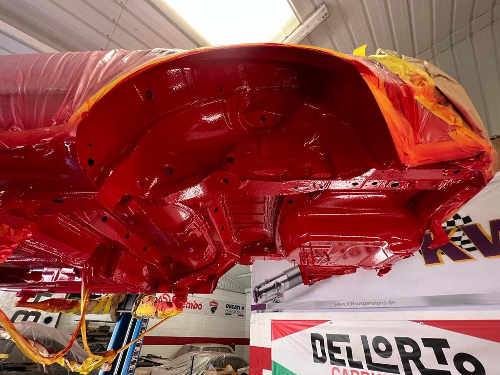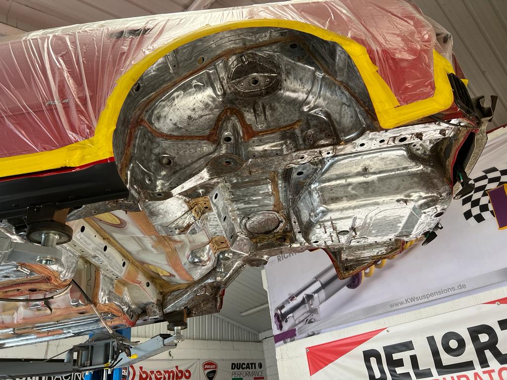 With all the corrosion removed, the bare underside was then treated with mastic epoxy followed by body colour and then finished with clear coat.