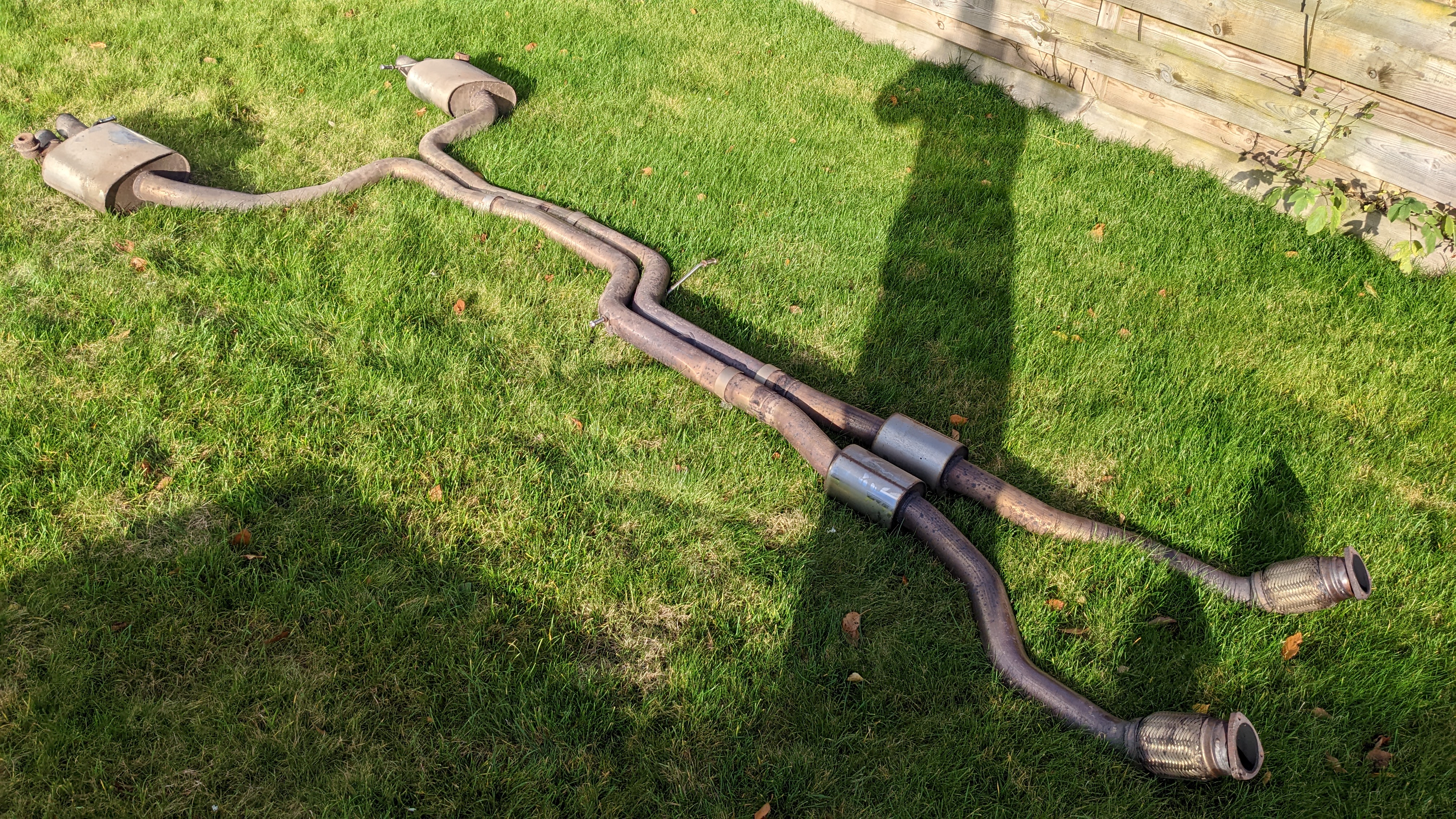 No dents to exhaust system, scratches to the bottom of downpipes but purely superficial, slight damage to the slip joint of one of the back boxes, shown in pictures and doesn't affect the exhaust sealing up as the slip joint is about 2" long.