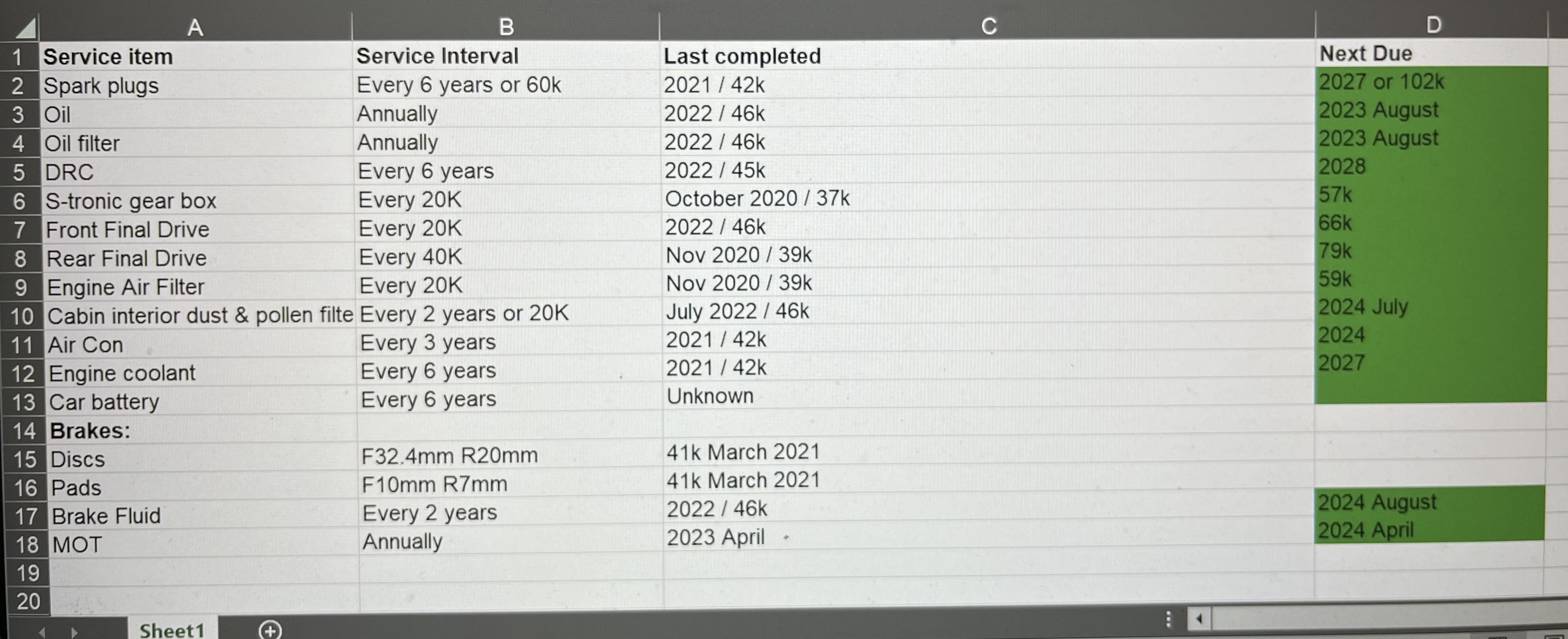 I’ve added a picture of the spreadsheet I use for maintenance tracking so anyone interested can get a sense of when next round of maintenance is due.