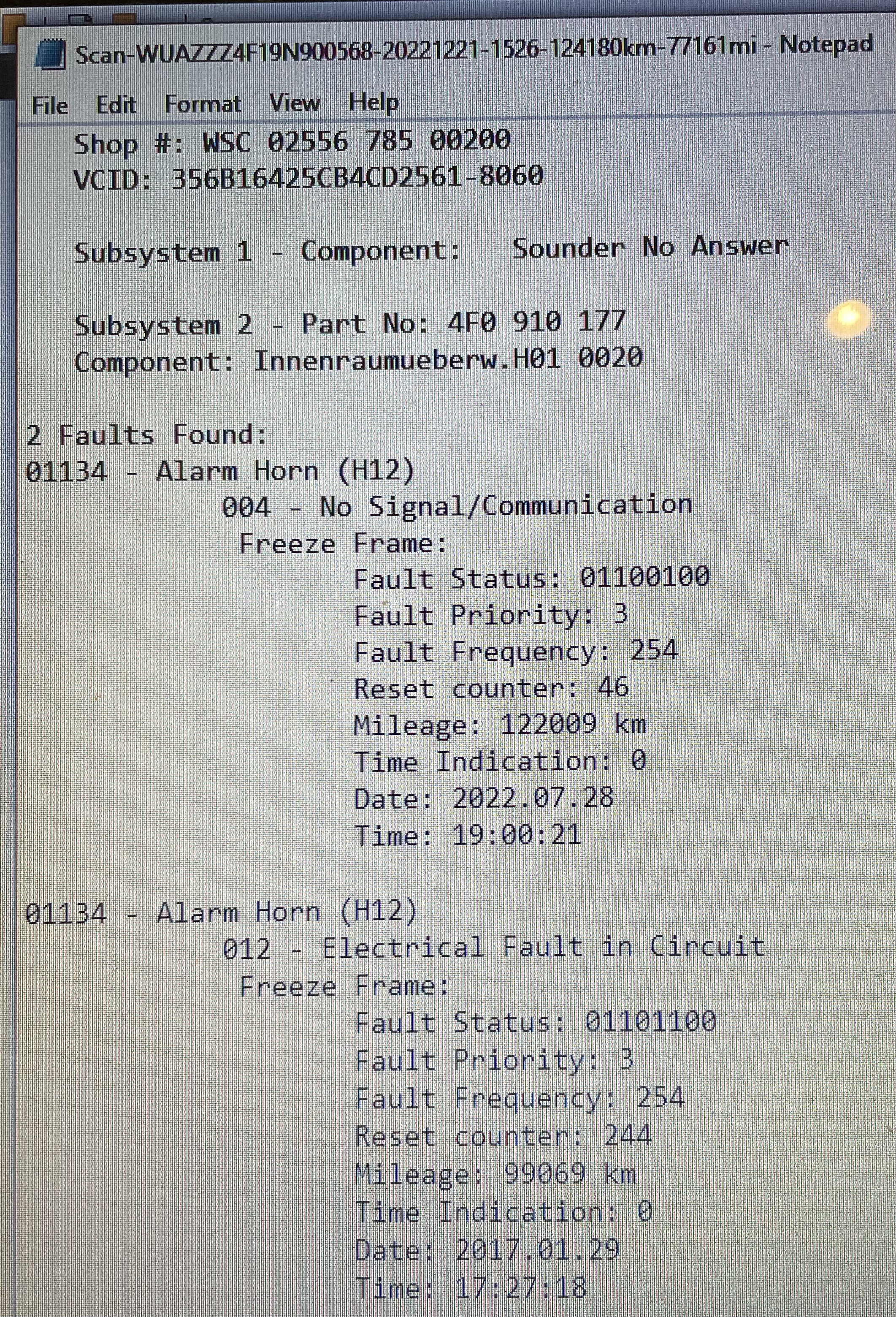 Getting the fault code 01134 Alarm horn H12 no signal on my rs6. I have swapped the alarm unit out under the front scuttle panel and no change.