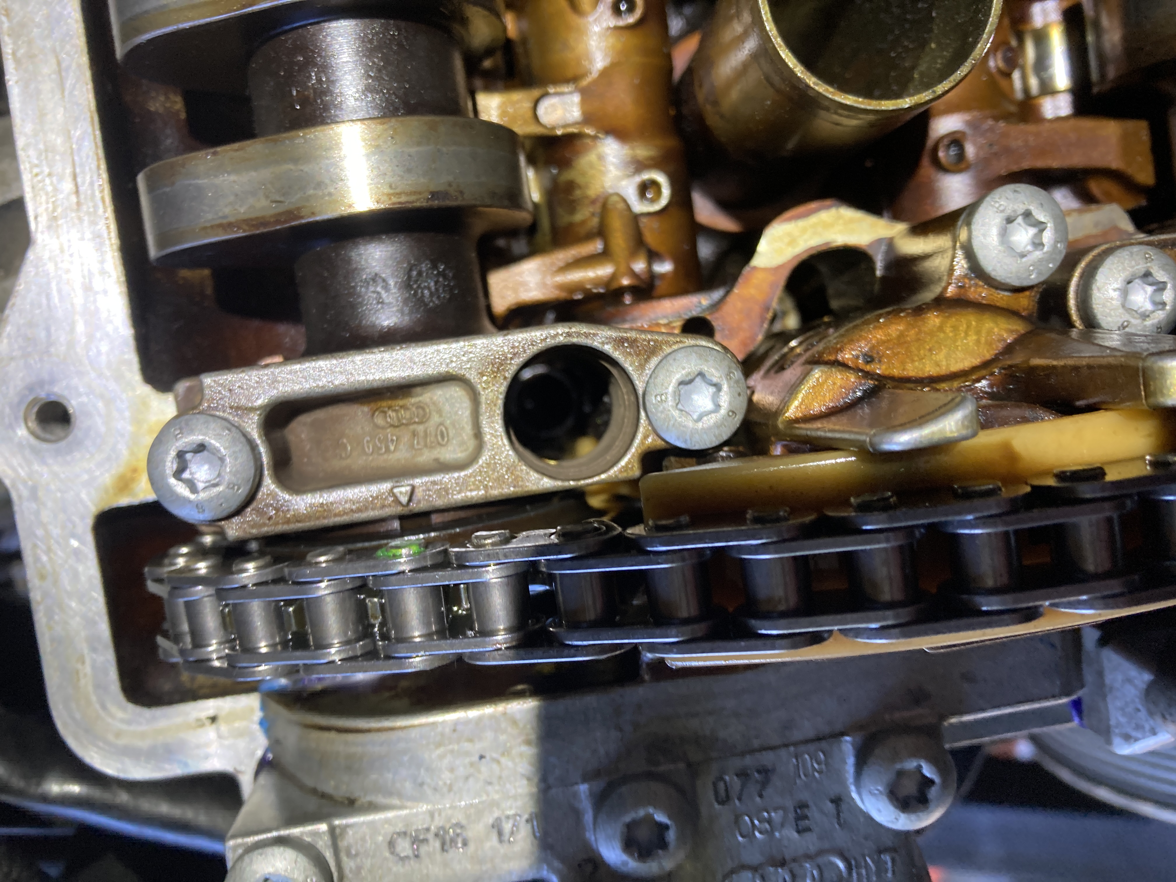 Yes, it’s normal for the chain to be a bit loose. As long as you have the right distance /number of rollers on chain between cams…The best way to prime the tensioner is to pre-fill it with new engine oil (if the tensioner is new or the old one has been taken apart), but the 2nd best is to turn the engine by hand a couple of revolutions (clock wise) once the timing belt is on and timing is good. After turning the engine by hand, if all 4 cams line up their notches with the cap arrows and the cam bar fits you should be good to go.2014audis8 wrote: ↑Fri Jun 06, 2025 6:51 pmHow loose was the chain when you got it on? Mine seems pretty loose right now. I’m assuming the new tensioner just needs to be primed with oil to tension the chain correct? Is there a good way to prime it? Also does this look close enough?