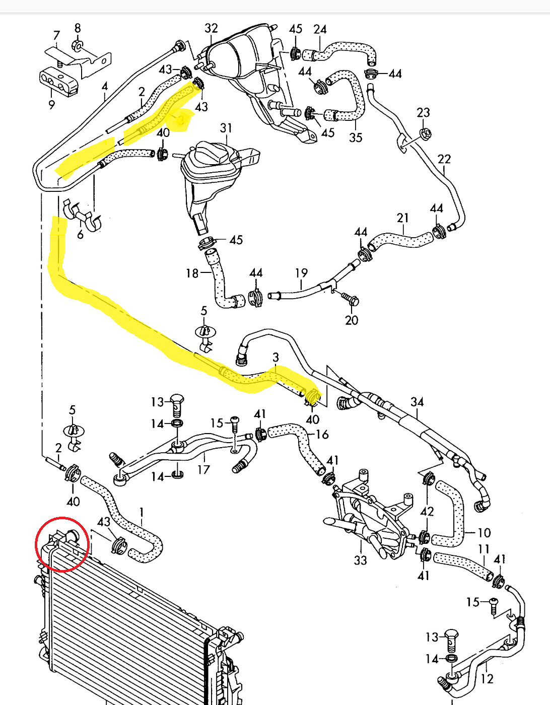 Having today fixed that radiator connection (see attached pic ) with another hose clamp, I noted that the smaller coolant (return?) line that goes into the same junction on the top corner of the radiator (red circle in the diagram and bottom right of photo) is buggered. There is literally not much plastic to clamp a hose clamp back on to and I guess this is actually part of the radiator side ?? Is it possible to get a replacement for just this part or do I need to get a whole new (very expensive!) radiator just to resolve this small piece of broken plastic on the corner?