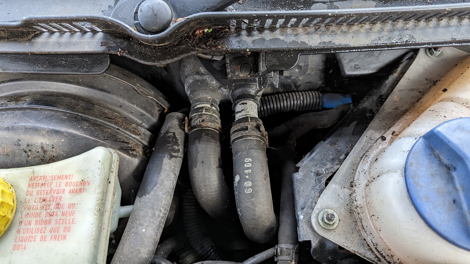 Note the right pipe especially. It is still partly on as the barbs are quite long. Sadly I think it is a stretch to hope that the coolant leak is coming from there due to the height, but of course I didn't know about it when the scuttle was on and possibly the pressurised system as the engine was warming could have been pushing the water out of there.