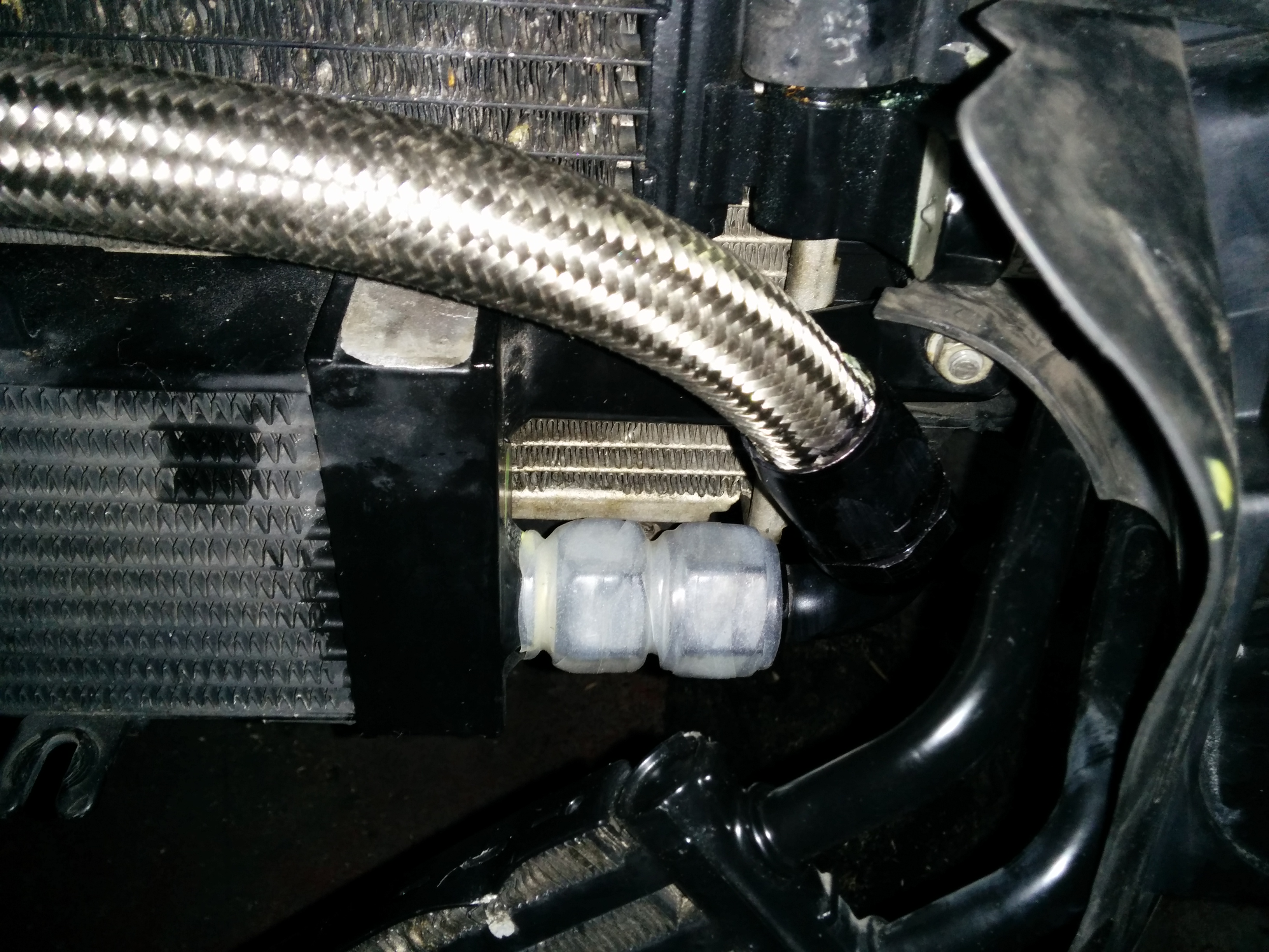 before i could bolt the front panel/rad pack back on i had to trim the back side of the front panel near to where the belt runs. i thought i might get away with leaving the mount for the engine under tray on but it was to close so had to come off. front panel on, loads of clearance another job that was still to do was separating my old oil cooler lines from the cooler. i ordered the jhm oil cooler lines as my car is still on the original lines, and they look well crusty.
