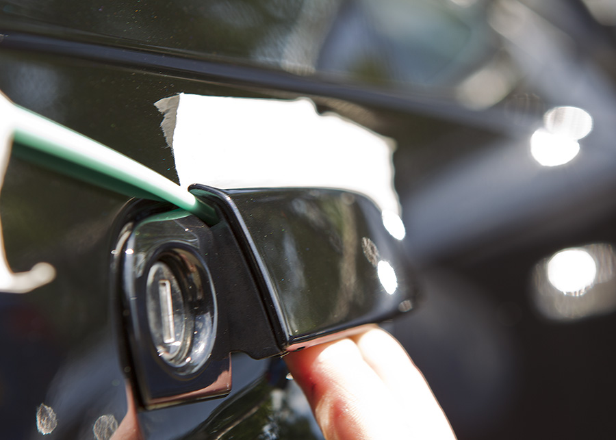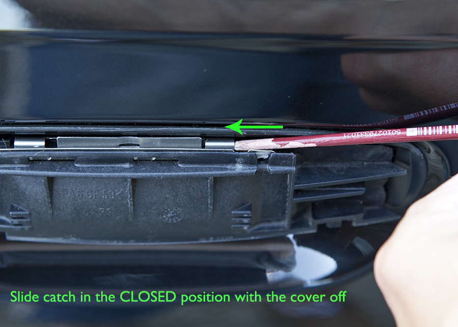 Overall its quite a simple fix. I found a small art brush buried in the bottom of my tool box which was similar diameter to that of an ink insert for a Bic Biro pen - DO NOT USE A SCREWDRIVER. Tape up the area with some masking tape to avoid any scratches to the paintwork, you can then lift the handle up two thirds of the way and look behind the top of the cover, you'll see two metal looking clips which are attached to each other in the shape of one long metal slider.