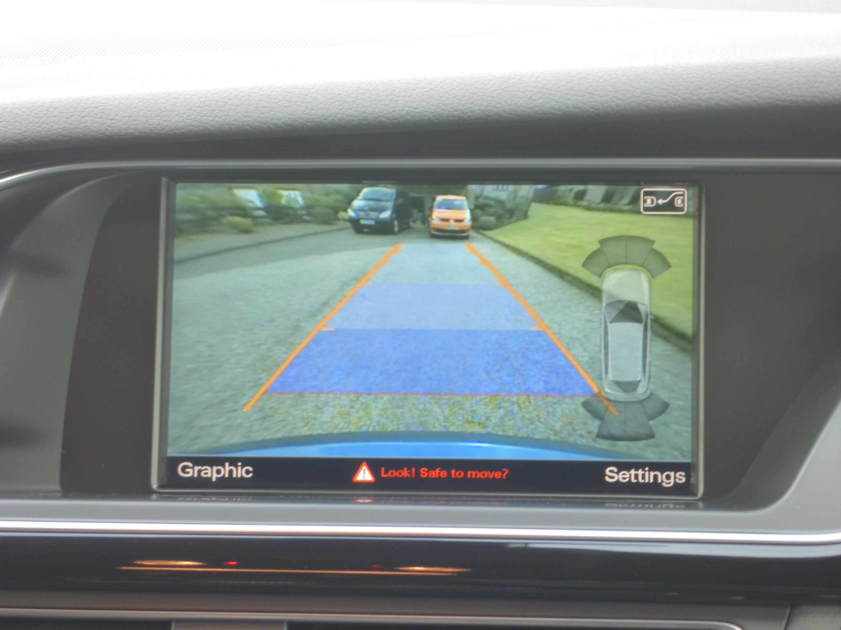 Audi parking system advanced. Aids parking by acoustically and visually indicating distances to obstacles with guiding lines and rear view camera with predictive positioning linked to steering input.