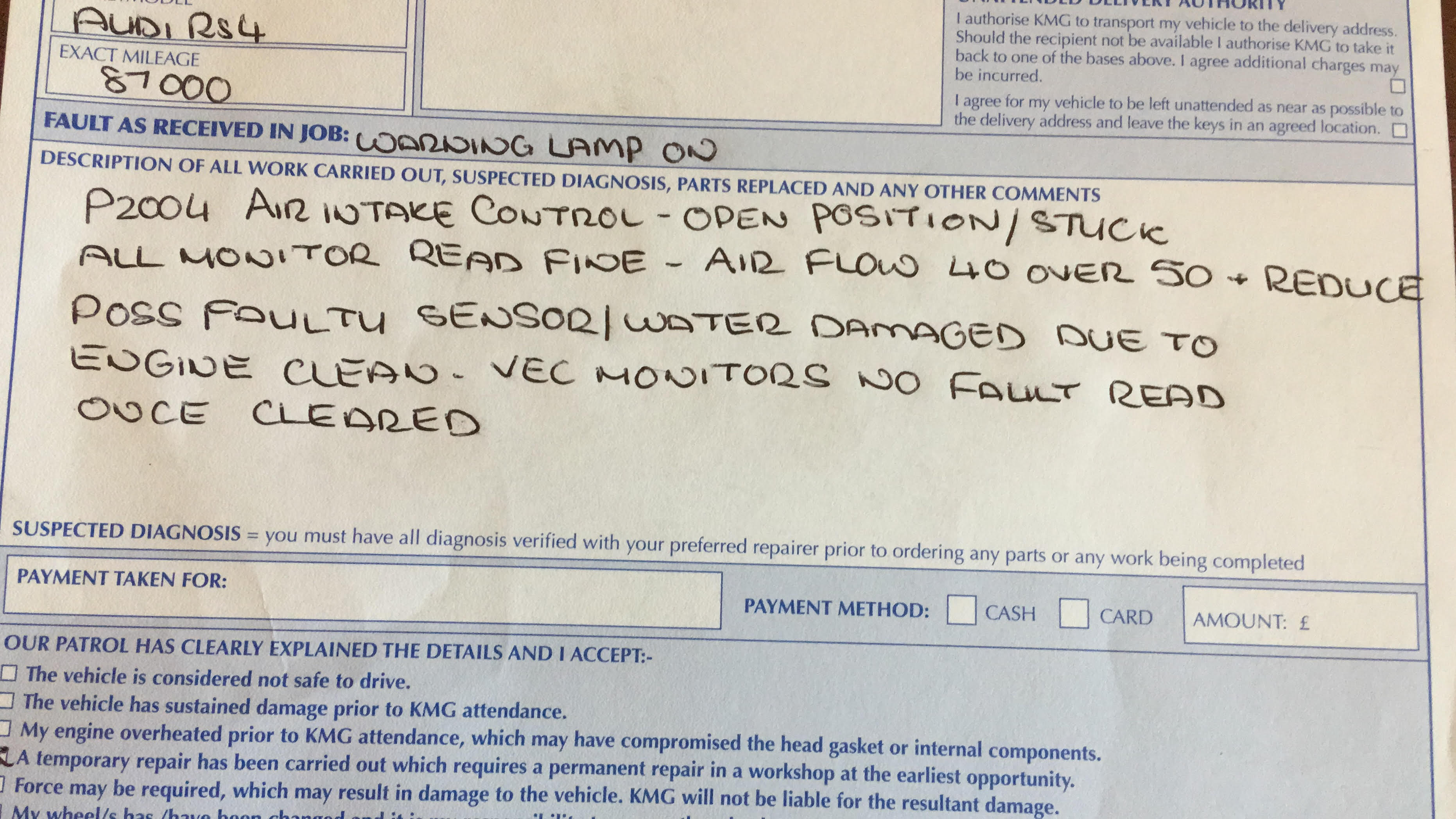 I've attached his diagnosis and he said it would be ok to drive to a garage to fix. It seems to run ok but rev limiter is on.