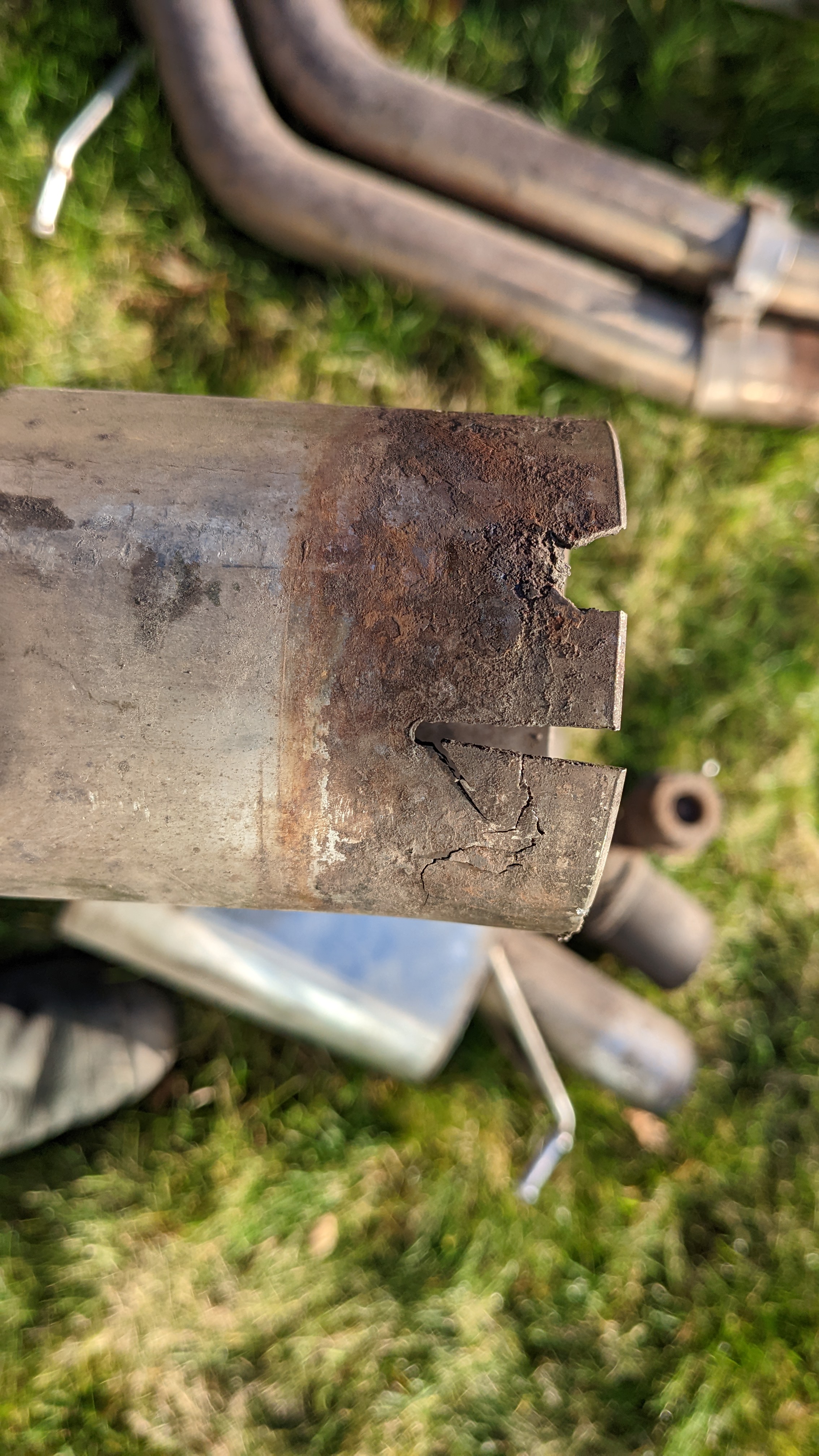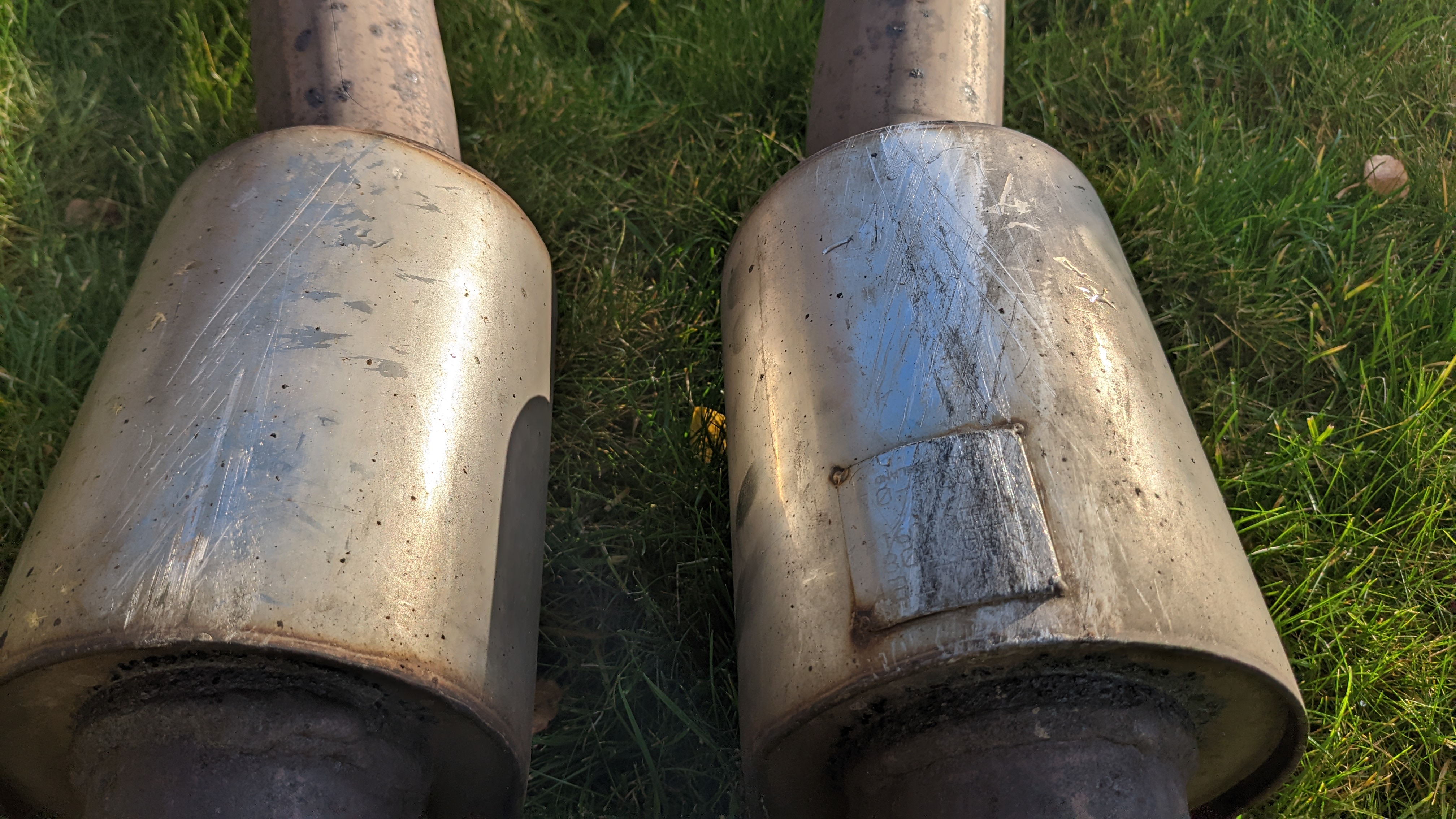 No dents to exhaust system, scratches to the bottom of downpipes but purely superficial, slight damage to the slip joint of one of the back boxes, shown in pictures and doesn't affect the exhaust sealing up as the slip joint is about 2" long.
